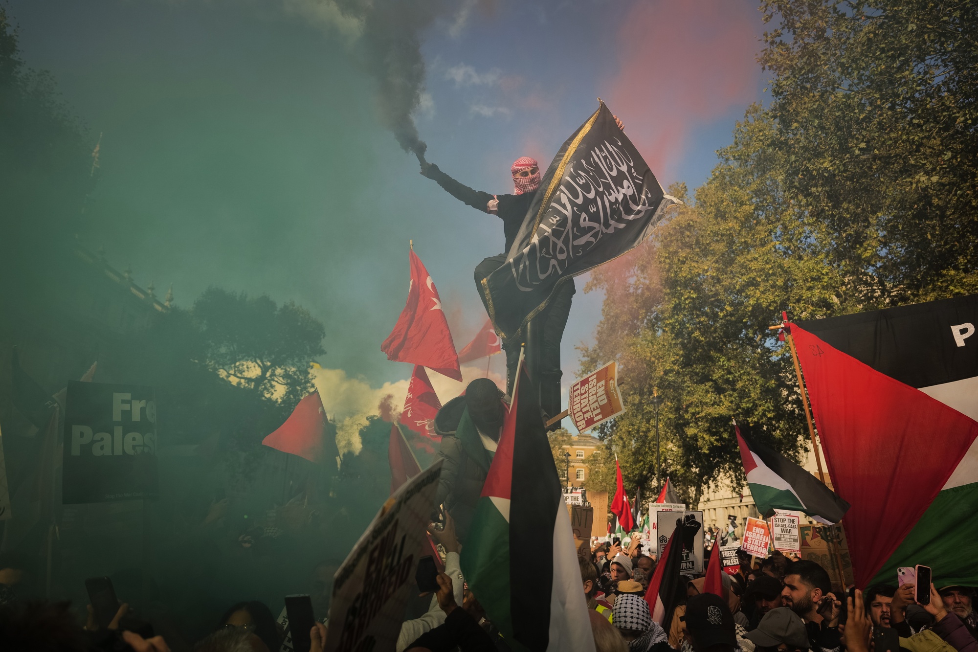 抗议者在10月14日在伦敦市中心的一次亲巴勒斯坦示威活动中放烟雾弹。
