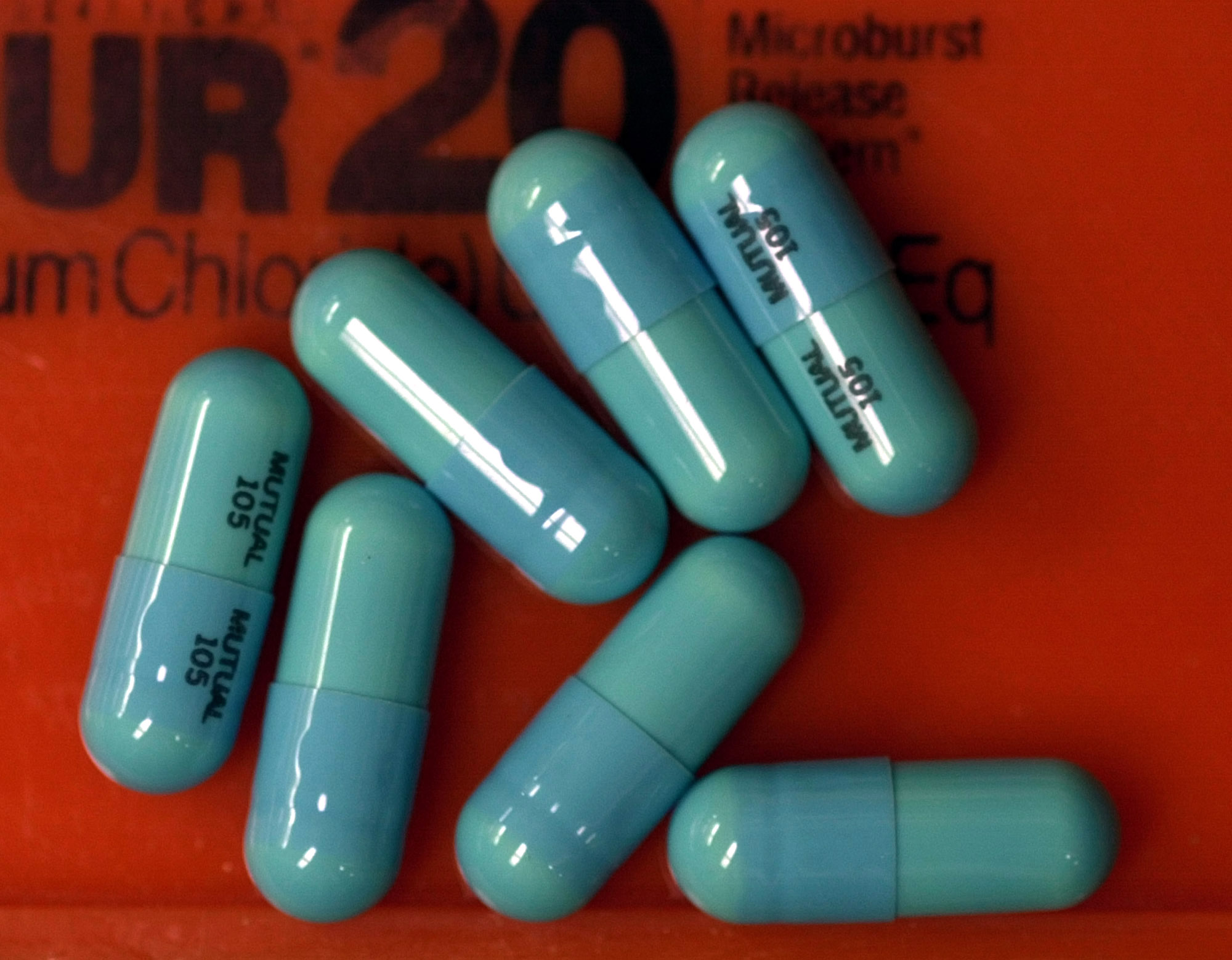 100毫克多西环素胶囊放在一个发药托盘上。旧金山公共卫生部建议高危人群在无套性行为后的72小时内服用一次非标签用途的抗生素剂量,以预防梅毒、沙眼和淋病。
