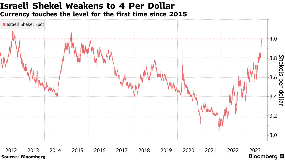 货币交易商已将谢克尔推至八年低点,并短暂突破每美元4谢克尔的象征性门槛,考验中央银行遏制以色列与哈马斯战争引发的市场冲击的决心。