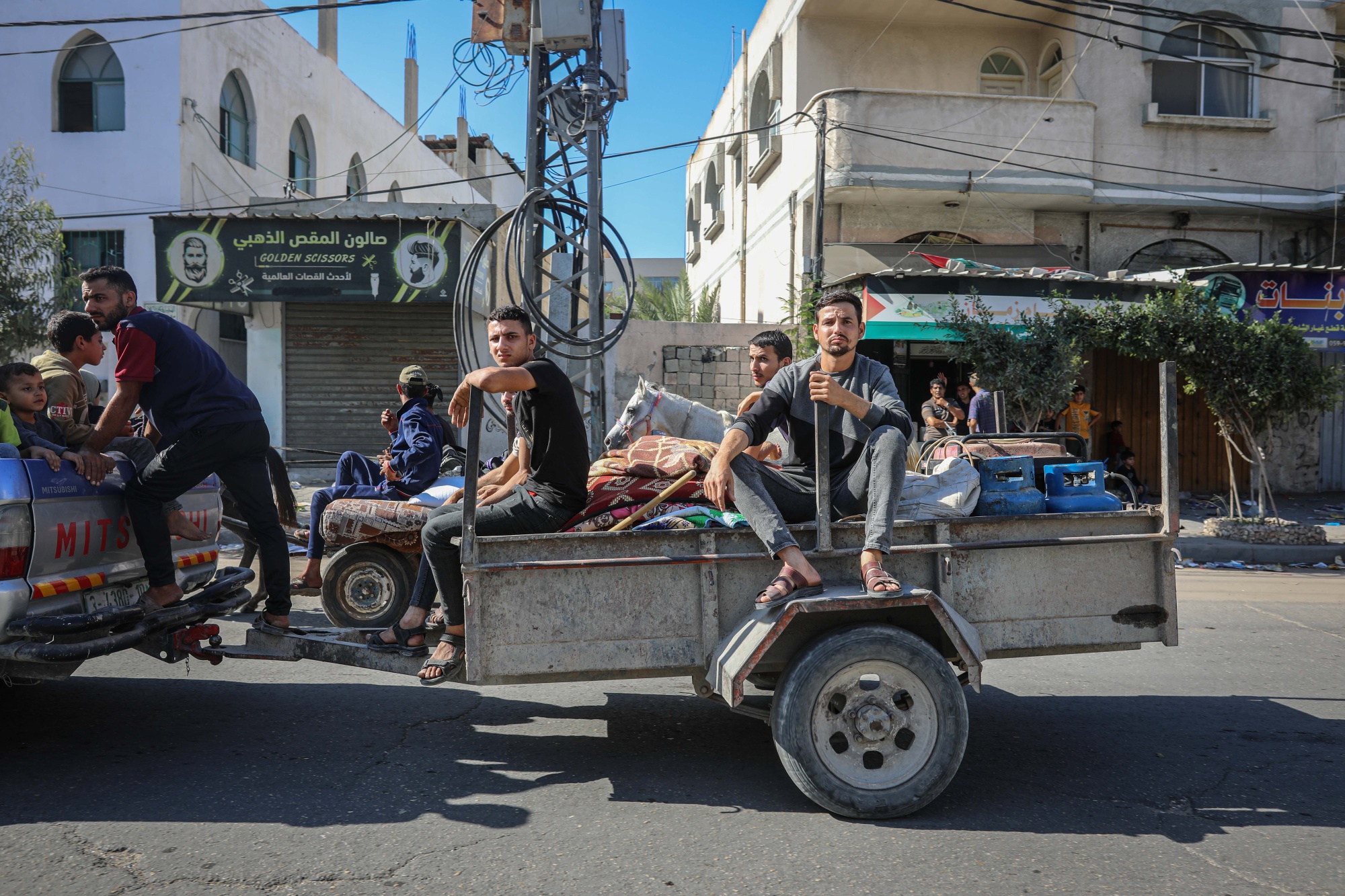 居民于10月16日离开加沙市的家园。摄影师:Ali Jadallah/Anadolu Agency/Getty Images据援助组织埃及食品银行负责人称,埃及西奈半岛上排队等待进入加沙的食品和医疗物资卡车车队。这是为了预期拉法赫口岸将会短暂开放,以允许援助物资的交付,尽管埃及人、以色列人和哈马斯都没有确认这将会发生。