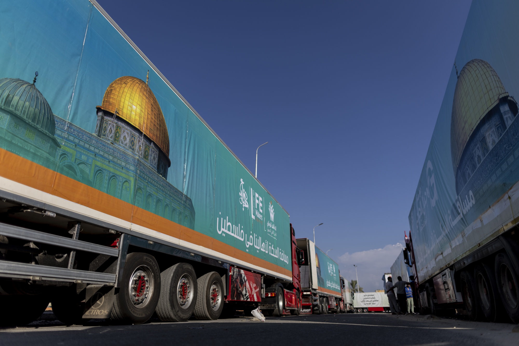 运送援助物资前往埃及拉法赫口岸的卡车,于10月16日。摄影师:马哈茂德·哈立德/盖蒂图片社阅读更多: 理解以色列-哈马斯战争根源的指南