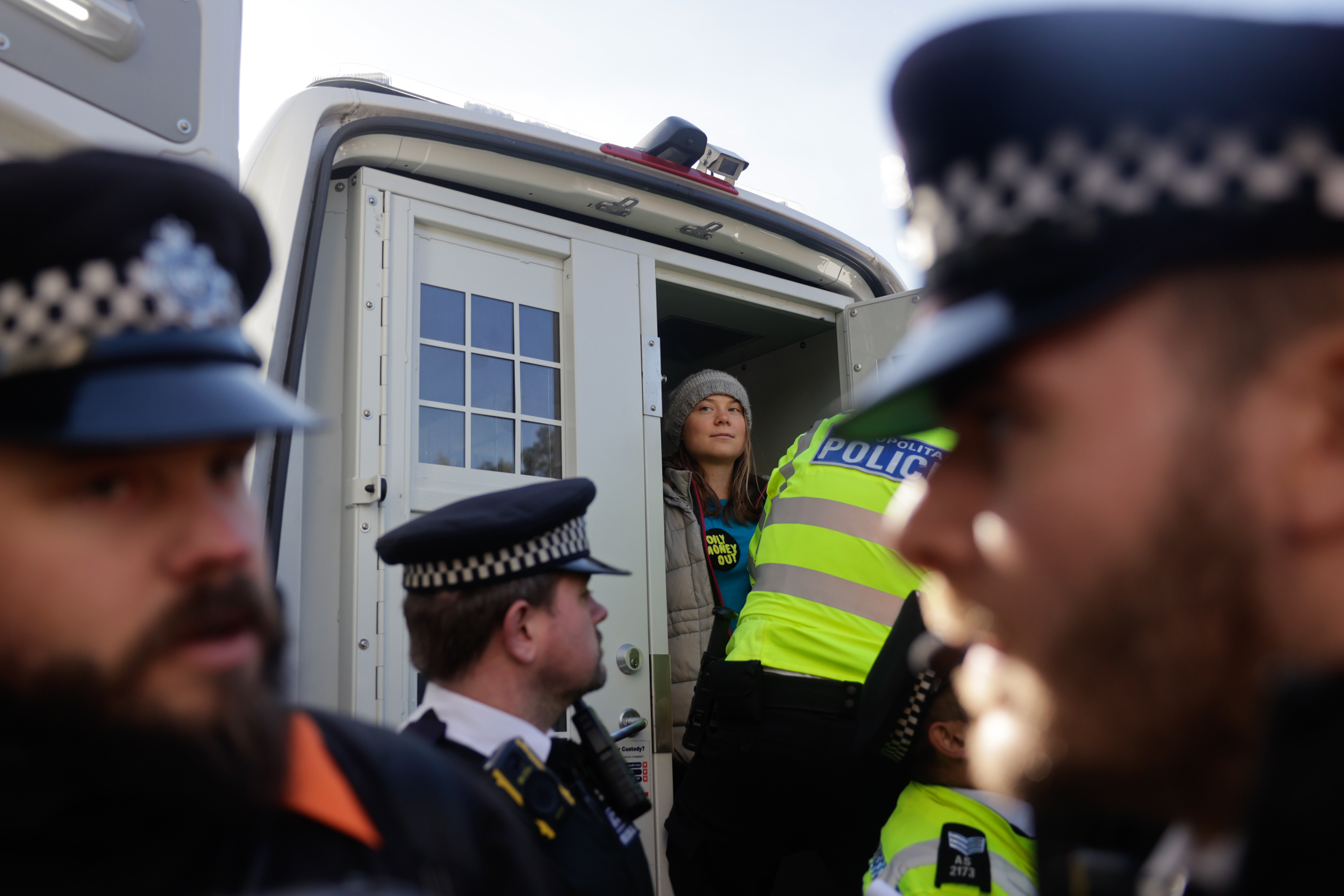 格蕾塔·桑伯格,气候活动家,在伦敦能源情报论坛会场外抗议时被逮捕
