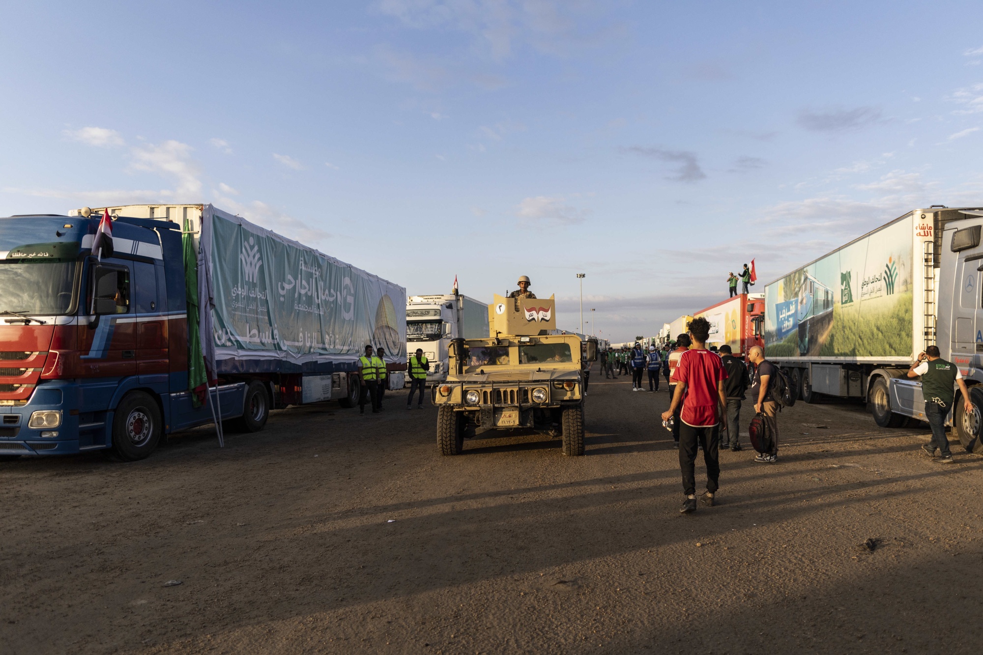 埃及北西奈拉法赫口岸附近的一队援助卡车,摄于10月17日。摄影师:马哈茂德·哈立德/盖蒂图片社### 寻求保证