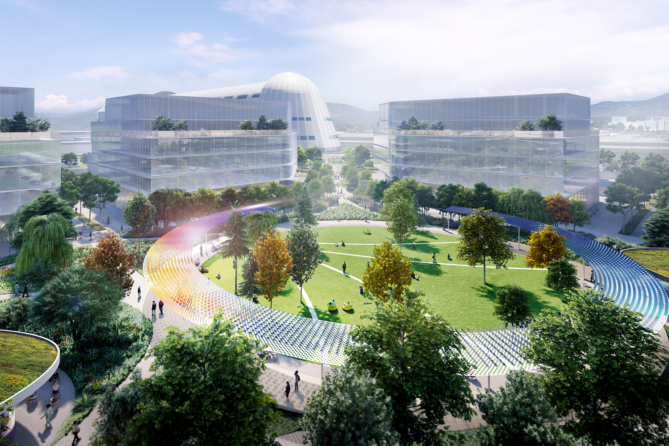 伯克利空间中心在NASA艾姆斯研究园的效果图。摄影师:Field Operations和HOK伯克利空间中心将在现有的美国国家航空航天局研究校园内的近35英亩(14公顷)用地上建设办公室、实验室、教室、住宅和零售空间。根据周一的一份声明,项目的未来阶段预计将包括短期住宿设施以及学生和教职员工住房。