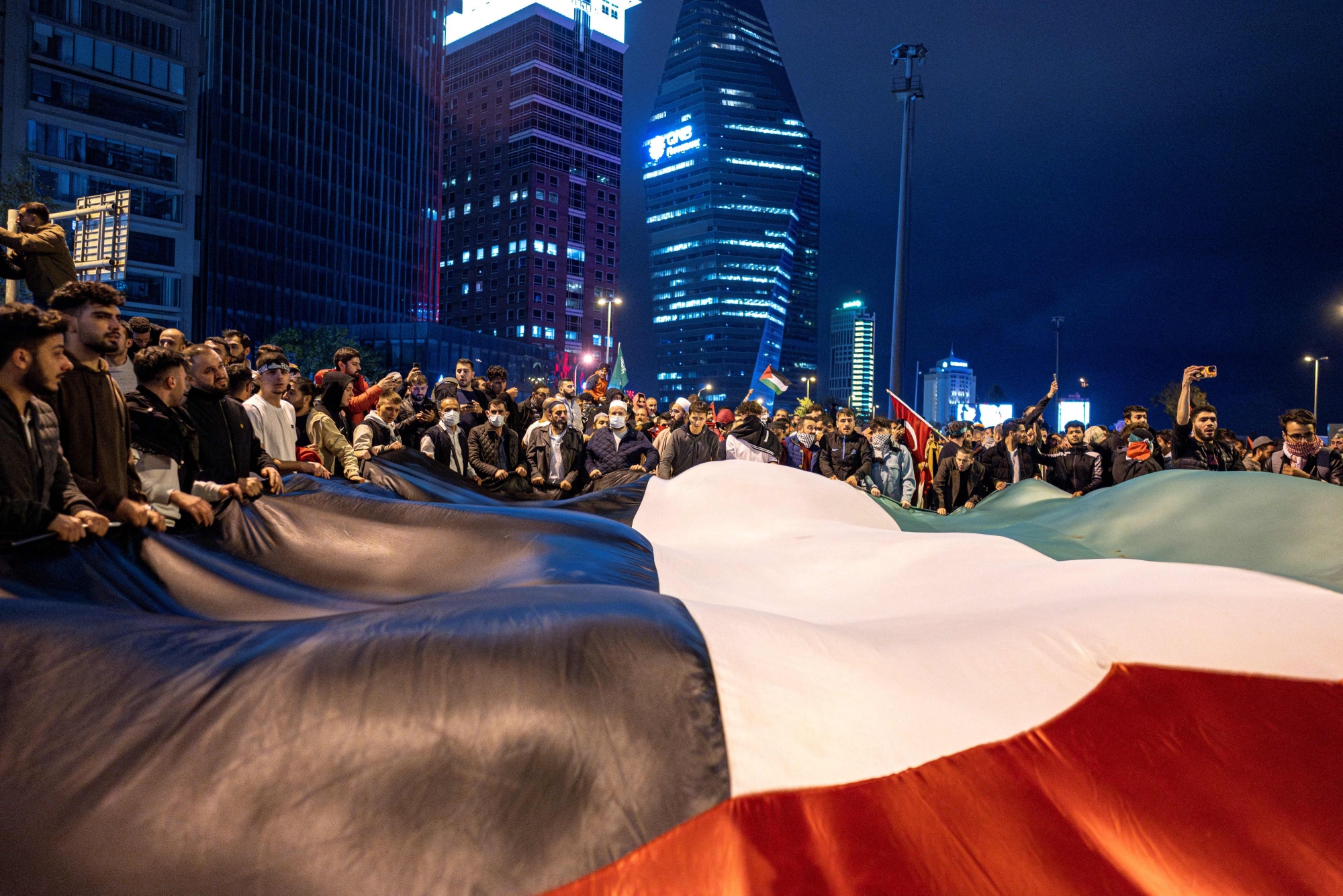 在伊斯坦布尔的抗议者在加沙医院遭袭击后举起巴勒斯坦国旗。摄影师:乌米特·图尔汉·科斯坤/法新社/盖蒂图片社由于大部分食物和药品供应被切断,边境关闭,以色列的空袭持续进行,加沙的情况日益严峻。