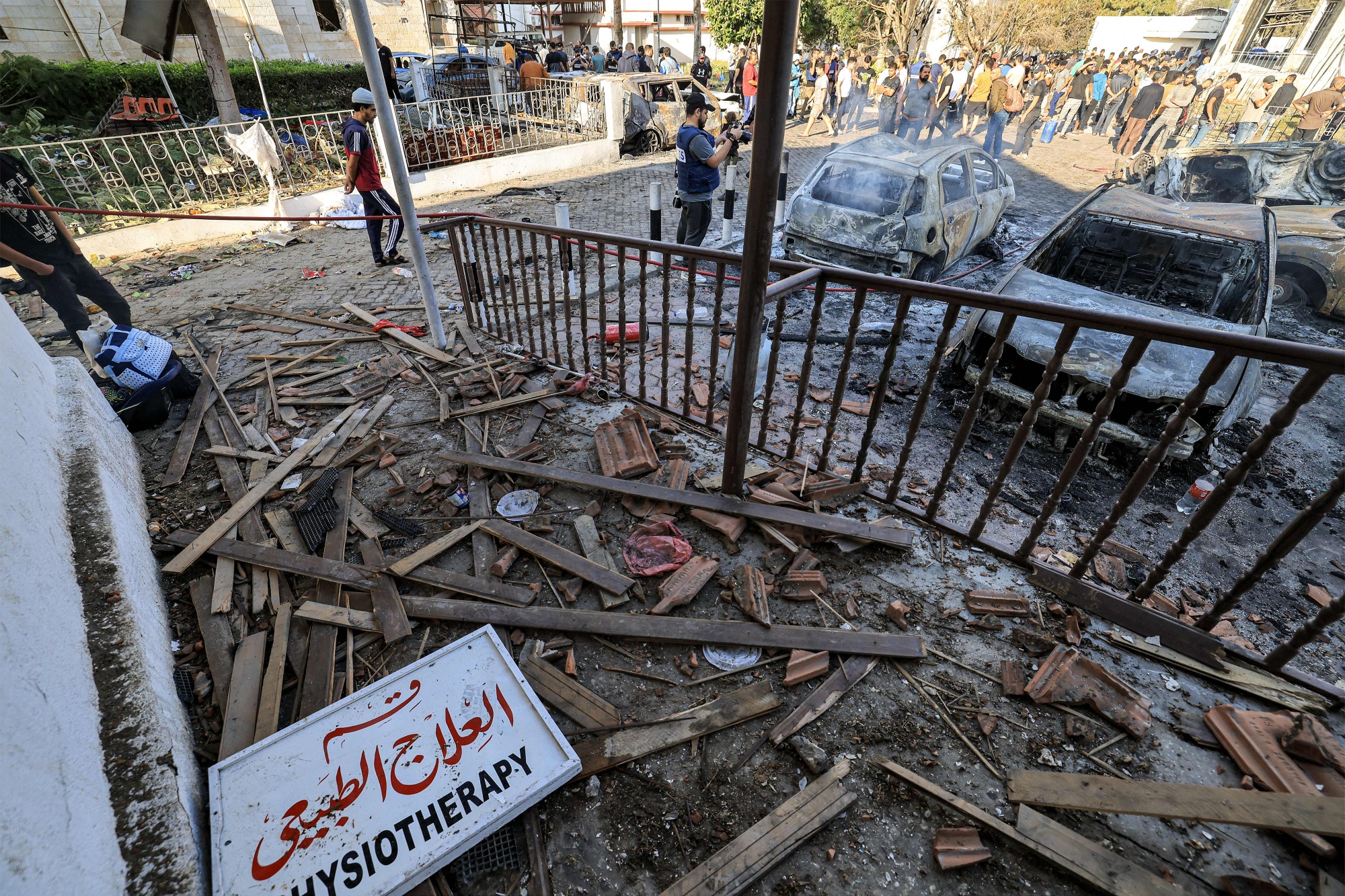 10月18日加沙阿赫利阿拉伯医院外的残骸。摄影师:法新社/盖蒂图片社不仅是拜登决定接受以色列对致命爆炸的解释,而且他这样做的方式可能会在该地区引起不满。通过表示“另一方”对事件负责,美国总统更加明确地站在了以色列一边。