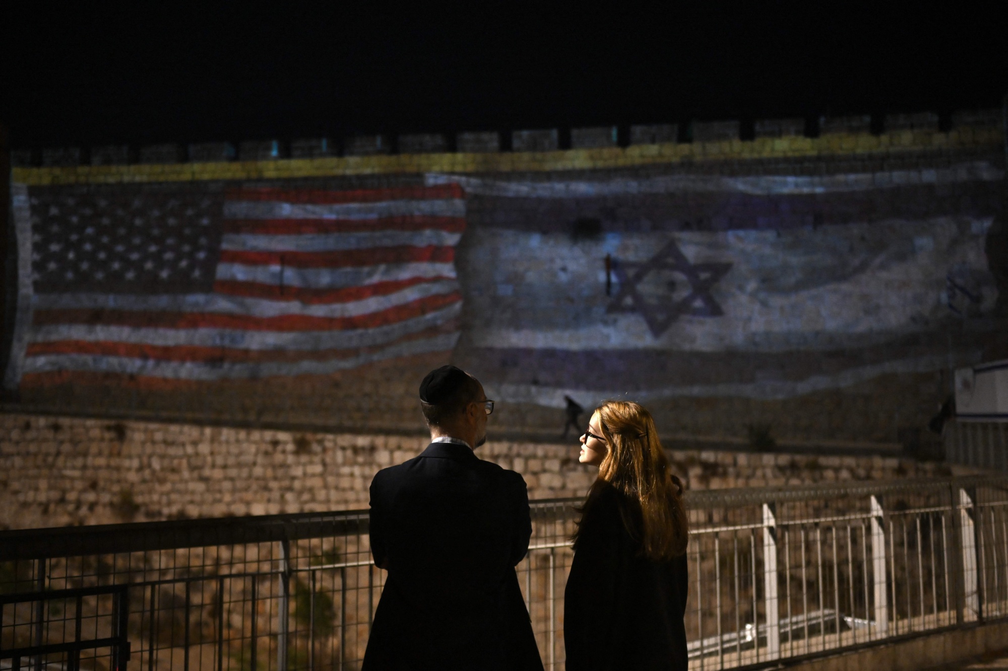 人们在10月18日在耶路撒冷的一堵墙前聊天,上面投影着美国和以色列国旗。摄影师:Aris Messinis/AFP/Getty Images“拜登决心认为有必要打败哈马斯,但他也希望保持以色列与阿拉伯国家之间的战略联盟和和平条约,并扩大它们,加深美国在中东的领导地位,”前国防部高级官员、退役少将阿莫斯·吉利亚德表示。“这就是为什么人道主义维度如此重要。”