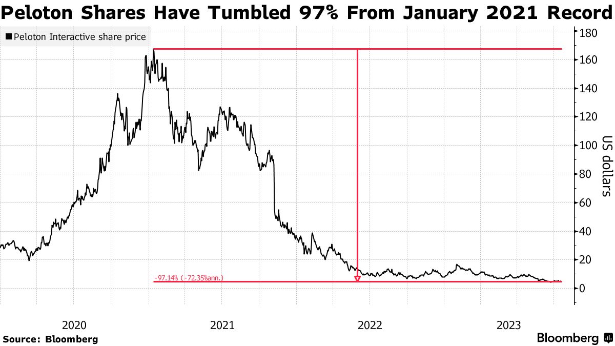 Peloton股票自2021年1月的高峰以来下跌了97%,因为该公司面临着需求放缓的挑战,随着人们在疫情后返回办公室和健身房。