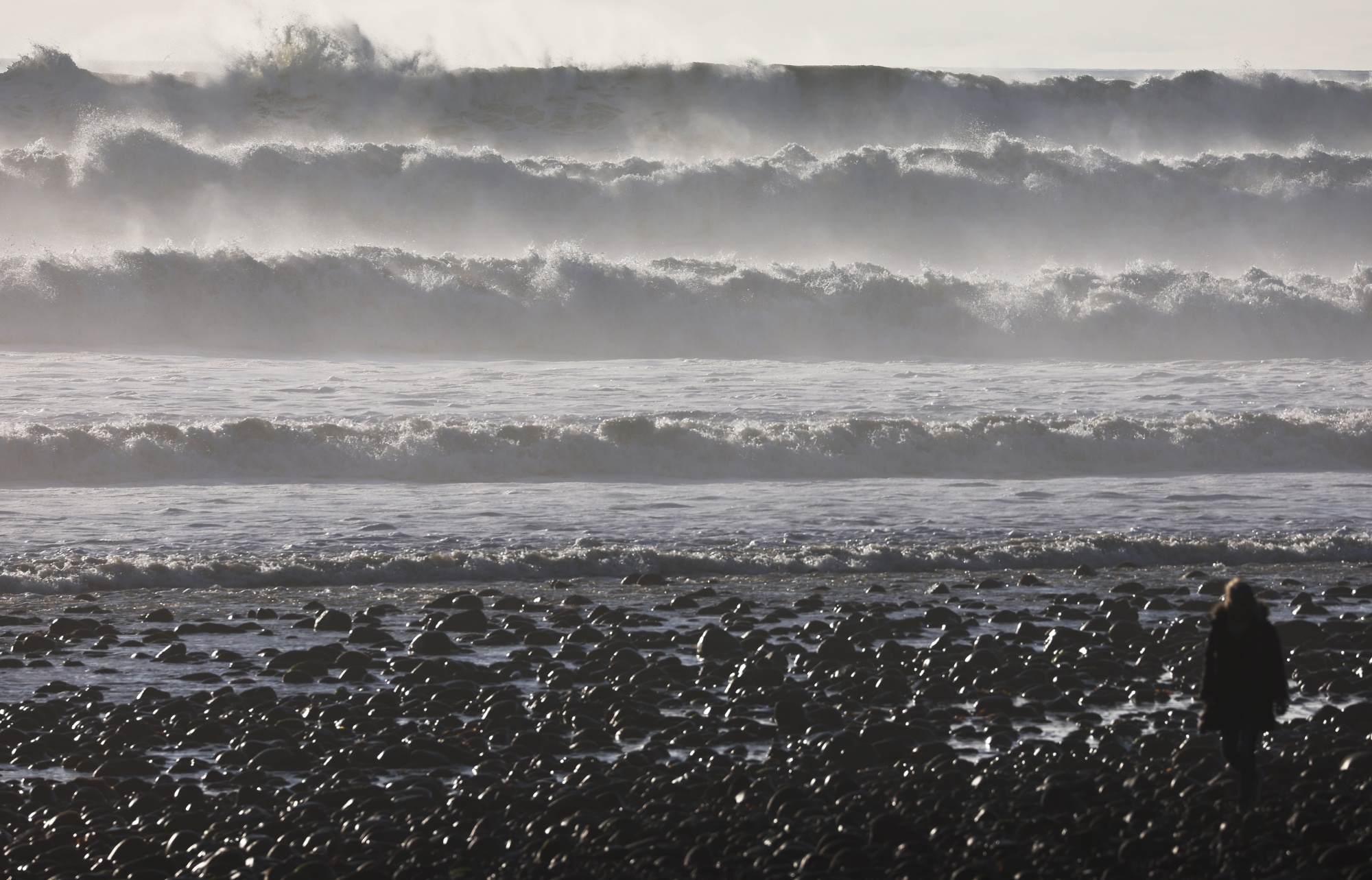 一名人士在2023年12月28日在加利福尼亚州文图拉市的海滩上散步,大浪滚滚而来。