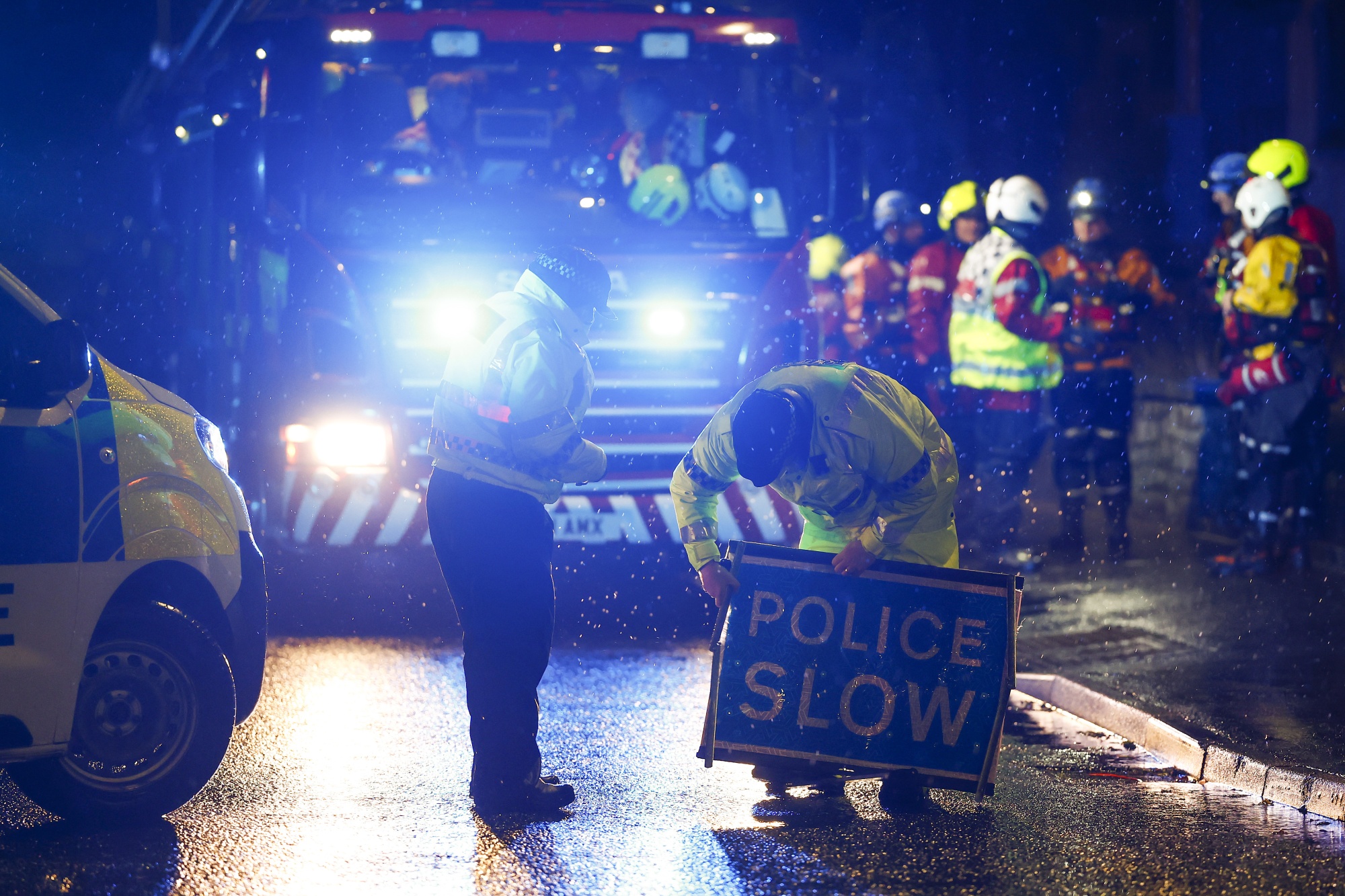 海岸警卫队成员挨家挨户在布雷欣进行搜救。苏格兰东部部分地区仍然处于红色预警之下。摄影师:杰夫·J·米切尔/盖蒂图片社