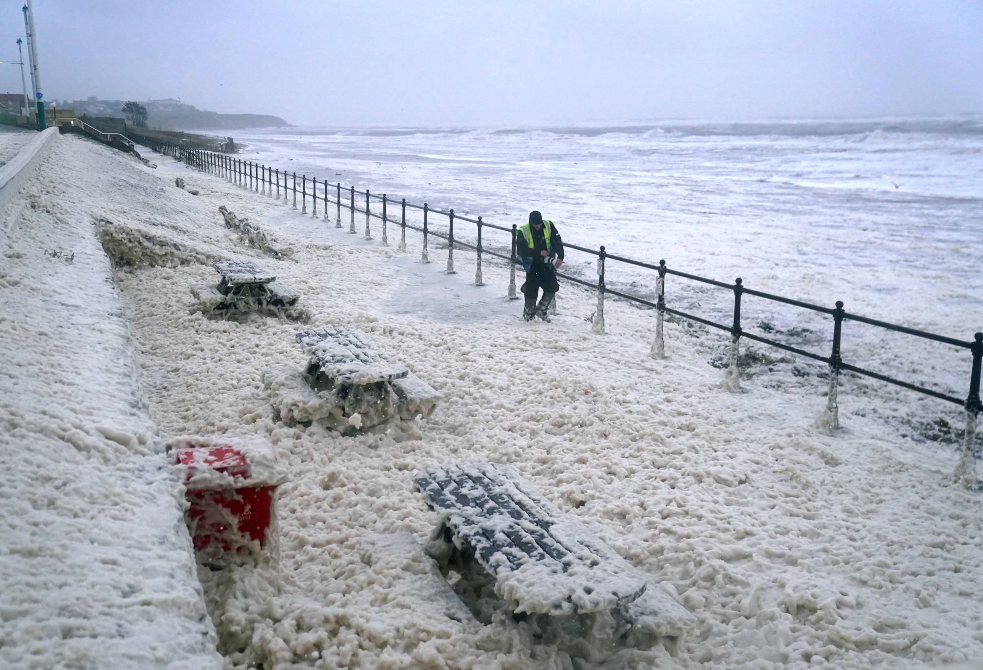英国西伯恩海滩上被风暴巴贝特搅起的海沫。摄影师:欧文·汉弗莱斯 - PA图片社/PA图片社预计该地区降雨量将达到250毫米(9.8英寸),周五早上处于红色预警之下,靠近珀斯和邓迪两座城市。苏格兰和英格兰部分地区将持续发布多个琥珀色和黄色天气预警直至周末。
