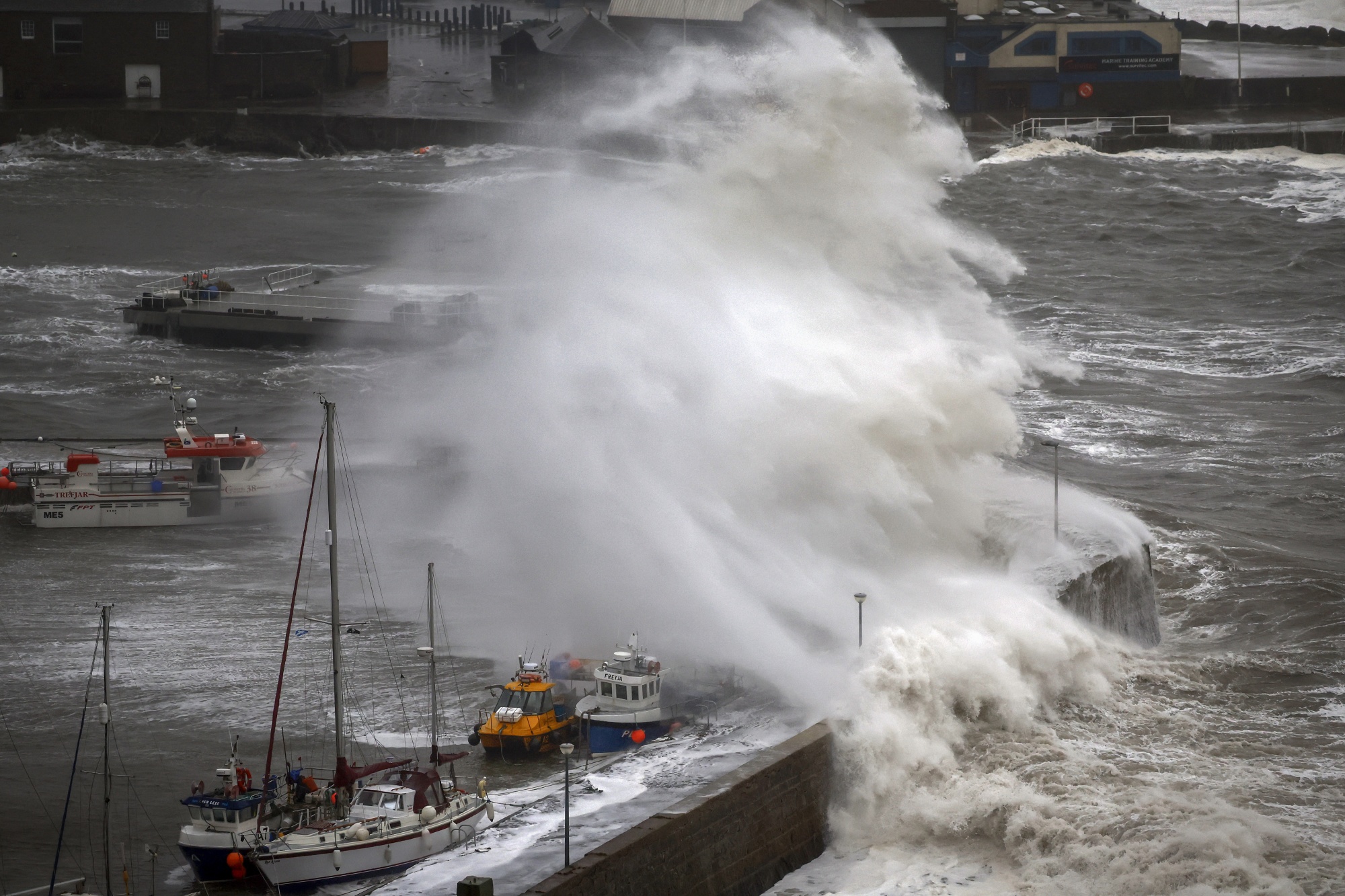 苏格兰斯通黑文港口的风暴浪激起的浪花。摄影师:Jeff J Mitchell/Getty Images