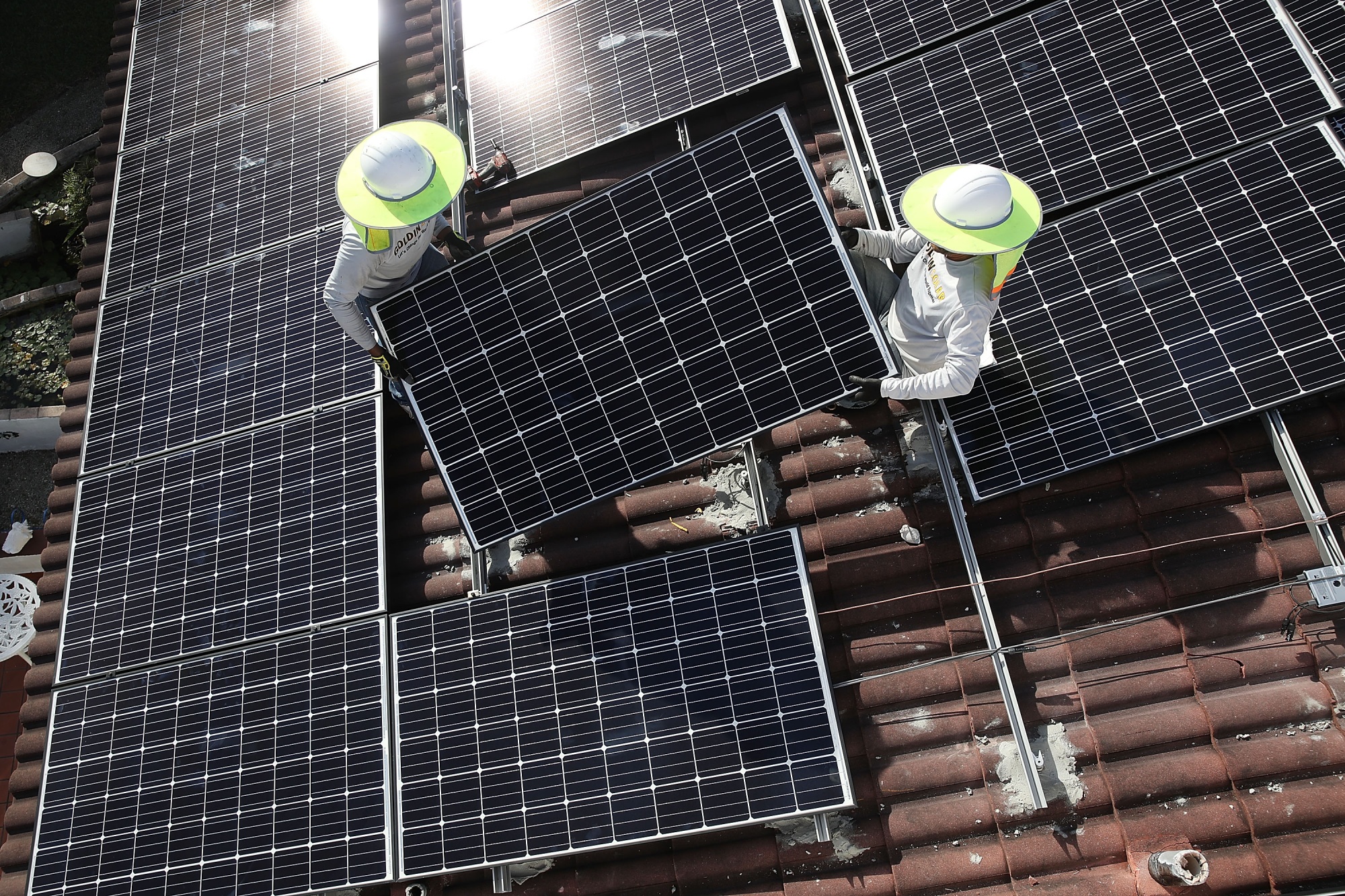 工人们在佛罗里达州帕尔梅托湾的一座房屋屋顶上安装太阳能电池板系统。