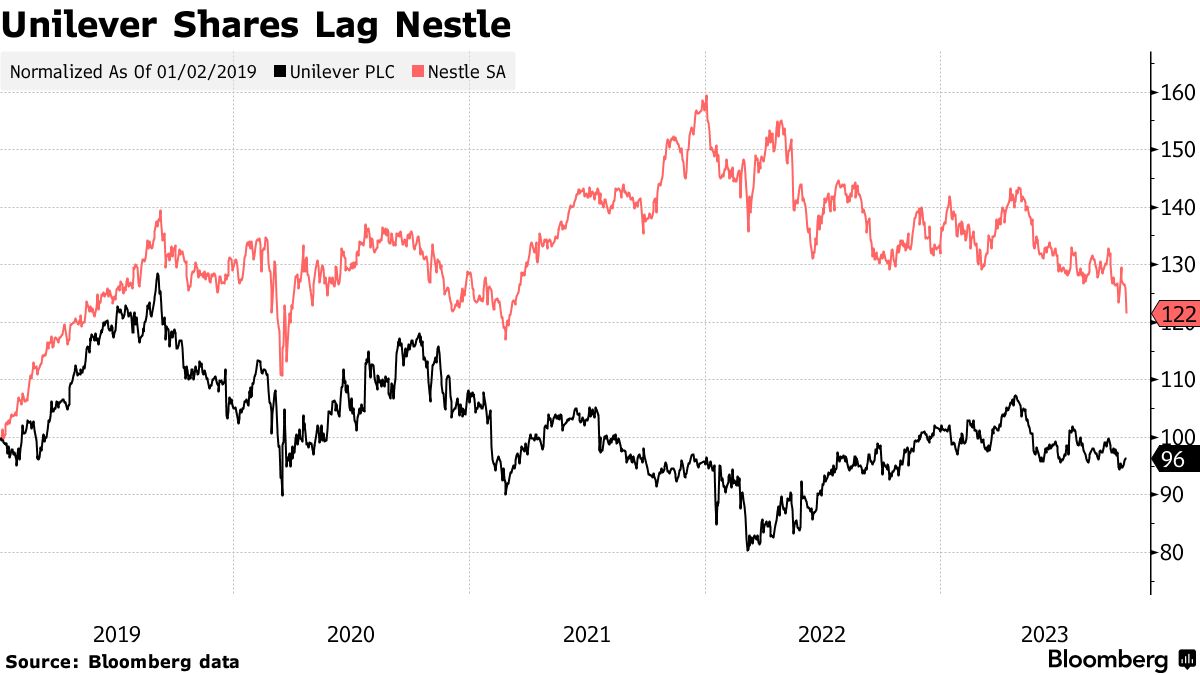 自2017年联合利华挫败卡夫亨氏提出的1,430亿美元收购企图以来,该公司一直追求盈利,而牺牲了对品牌的投资。这导致失去市场份额和增长乏力,而它试图通过昂贵且有时构思不周的收购来填补这一缺口。联合利华目前在不到一半的业务中赢得市场份额,四十年来最严重的通货膨胀已经迫使购物者转向白标产品。