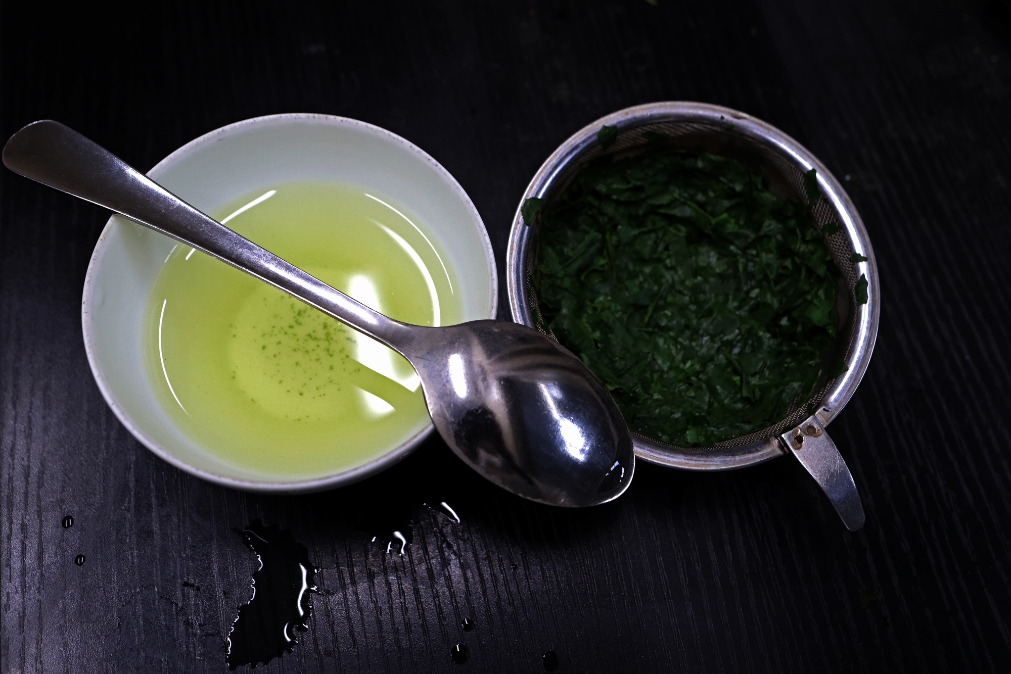 一杯被称为“碾茶”的绿茶在日本京都南山城的中碾茶加工厂进行检查。