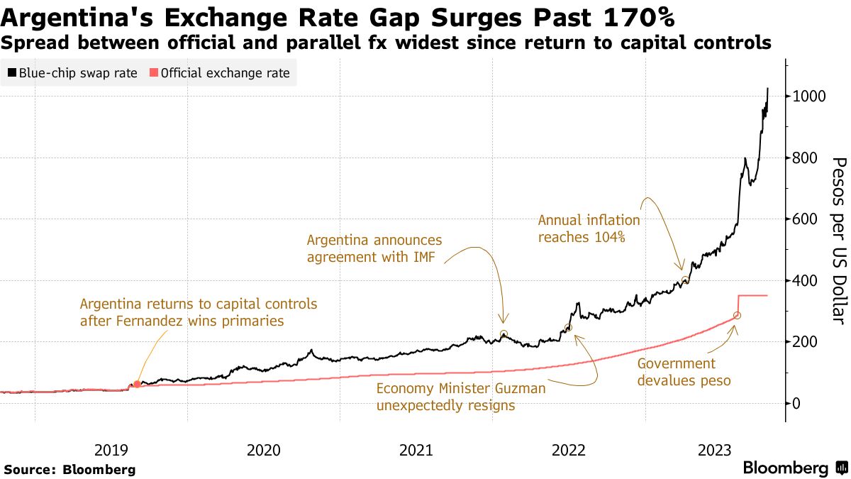 该国正面临十年来第六次经济衰退,并且通货膨胀率飙升至上世纪90年代初超级通货膨胀结束以来的最高水平。阿根廷比索持续贬值导致官方汇率和平行汇率之间的差距激增至超过170%。