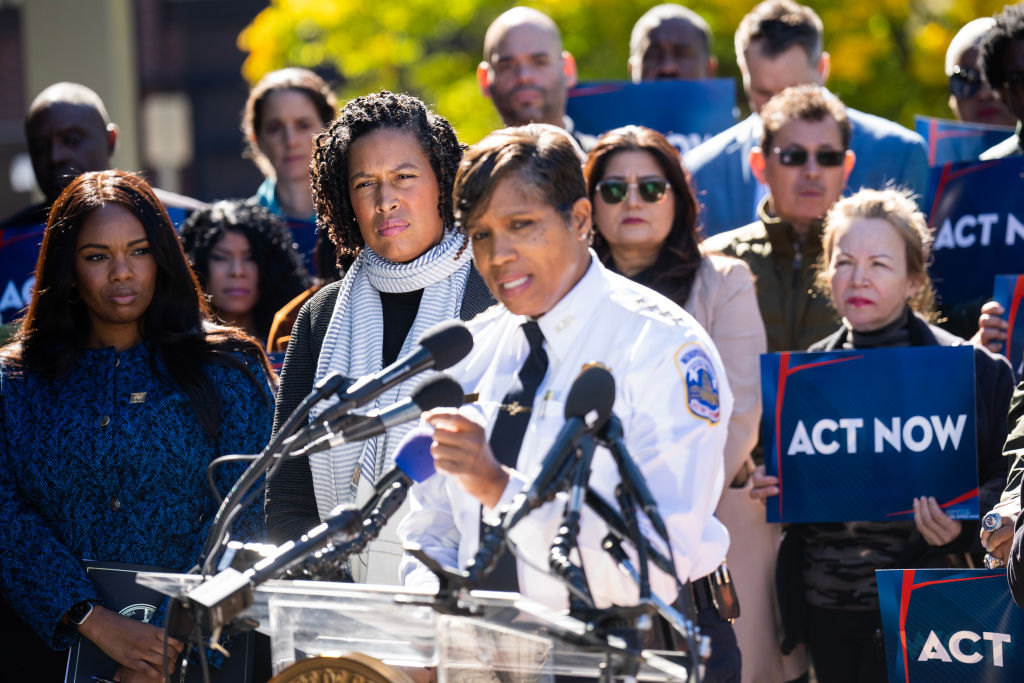华盛顿特区代理警察局长帕梅拉·史密斯与市长穆里尔·鲍泽(左)和其他官员一起出席了一场新闻发布会,发布了旨在“减少特区犯罪”的新提议立法。