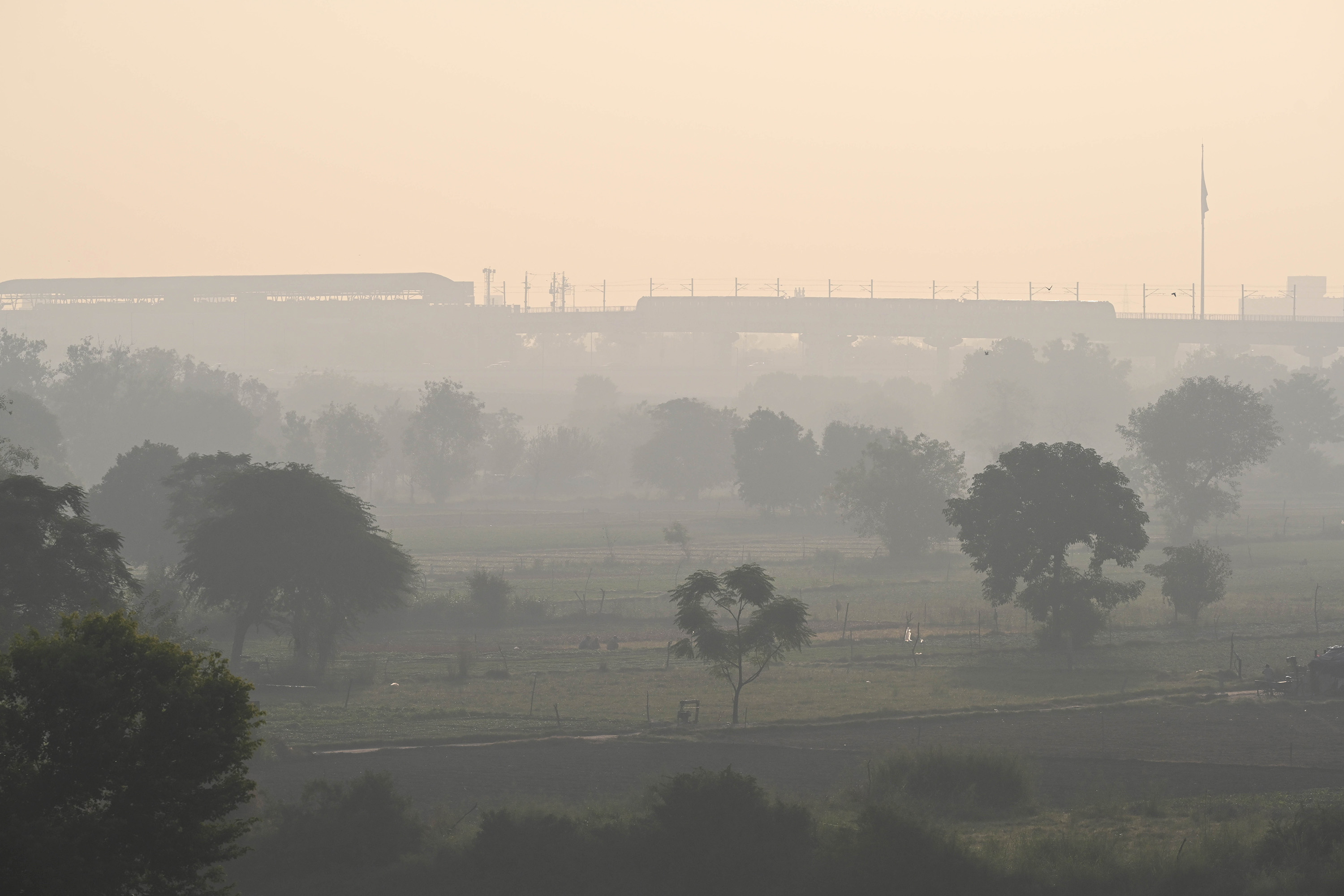 德里地铁列车在10月19日接近雅姆纳河岸的雾霾中行驶,印度新德里。