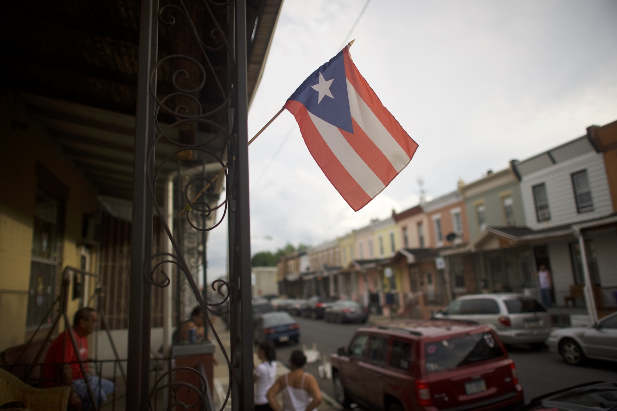 波多黎各国旗悬挂在费城北部亨廷公园社区的一排联排别墅前。