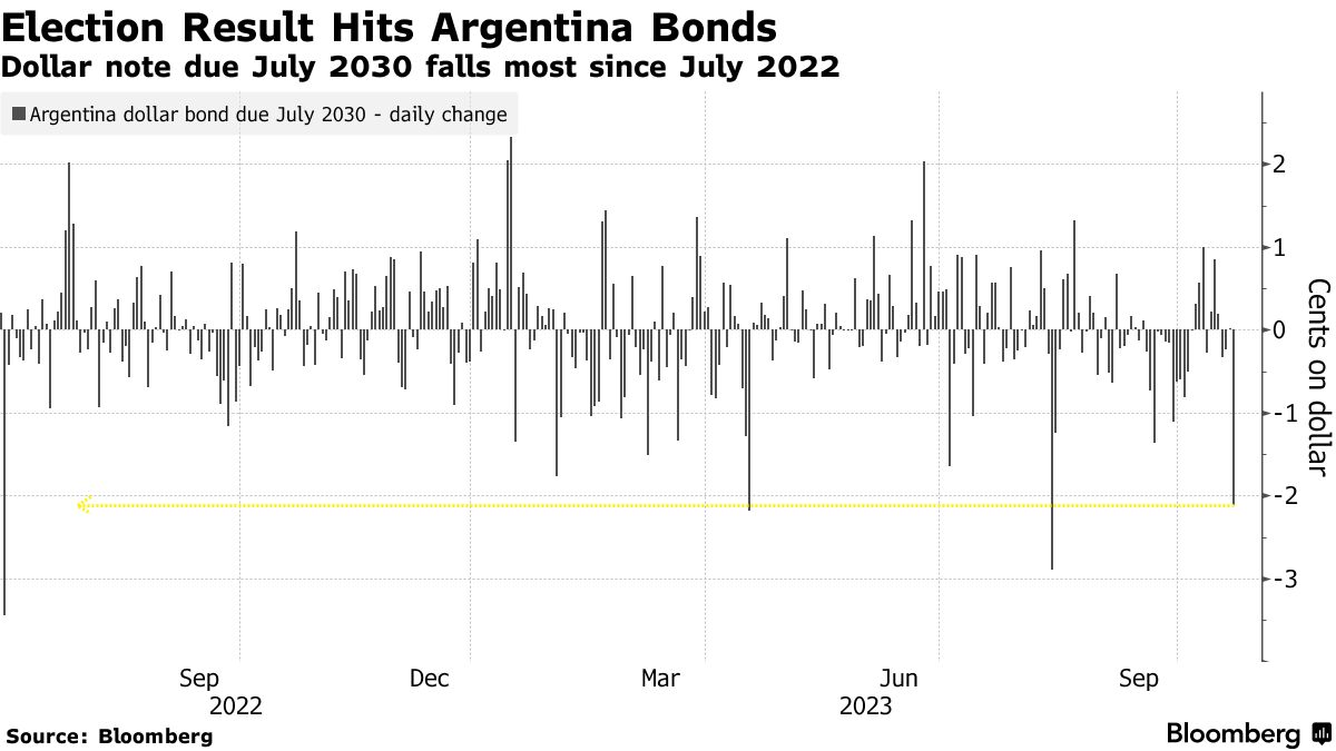 许多南美国家的主权债券在周一下跌了大约两美分,因为经济部长塞尔吉奥·马萨在周日的选举中意外领先。马萨现在将与局外人哈维尔·米莱对决,这是投资者最担心的政治两极化情景。
