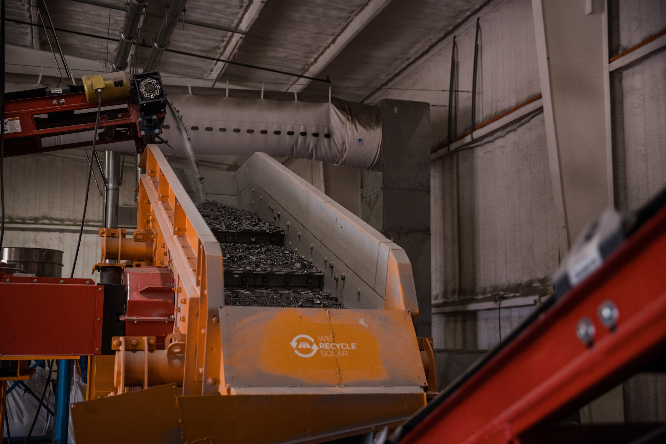 在亚利桑那州尤马郊区一个嘈杂的工业厂房内,有一台机器将旧太阳能电池板粉碎成碎片。它每分钟可以处理10块电池板,每天多达7500块,提取铜、银和铝的碎片,将大部分其余部分粉碎成粗粉。