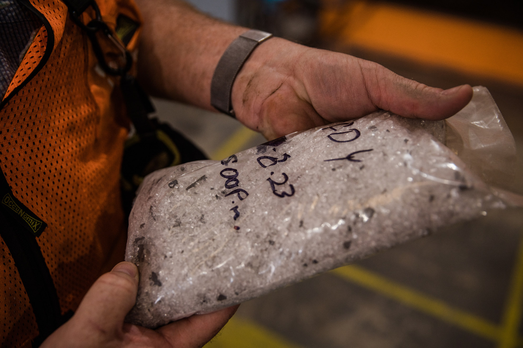 铝、铜和其他材料都是从面板中提取出来的。摄影师:凯特琳·奥哈拉/彭博社每块面板的重量约15%来自铝,主要是框架,70%是玻璃。有些周,公司可能会卖出约5万磅的铝作为废金属。铜和银更有价值,但数量不多。通过机器处理后,最终产品之一是一种颗粒状粉末,主要是玻璃,可以作为喷砂材料出售。