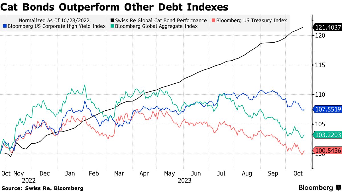 灾难债券因其回报率超过几乎所有其他债务市场而日益受到欢迎。今年,这些证券上涨约17%,而美国国债投资者亏损。这些工具奖励购买者承担保险市场风险,随着极端天气事件的增加,这种风险正在上升。