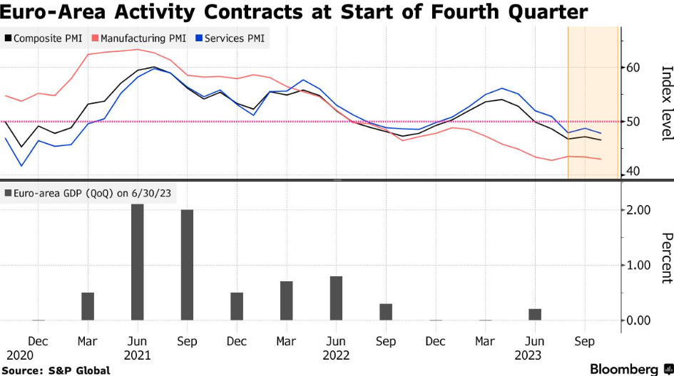 十月份,欧元区私营部门活动继续收缩,增加了该地区经济在下半年陷入衰退的风险,标普全球的商业调查显示。这些数据肯定会引起雅典会议上的欧洲央行官员的关注,因为这提供了更多证据表明他们的历史性加息行动正在产生影响。