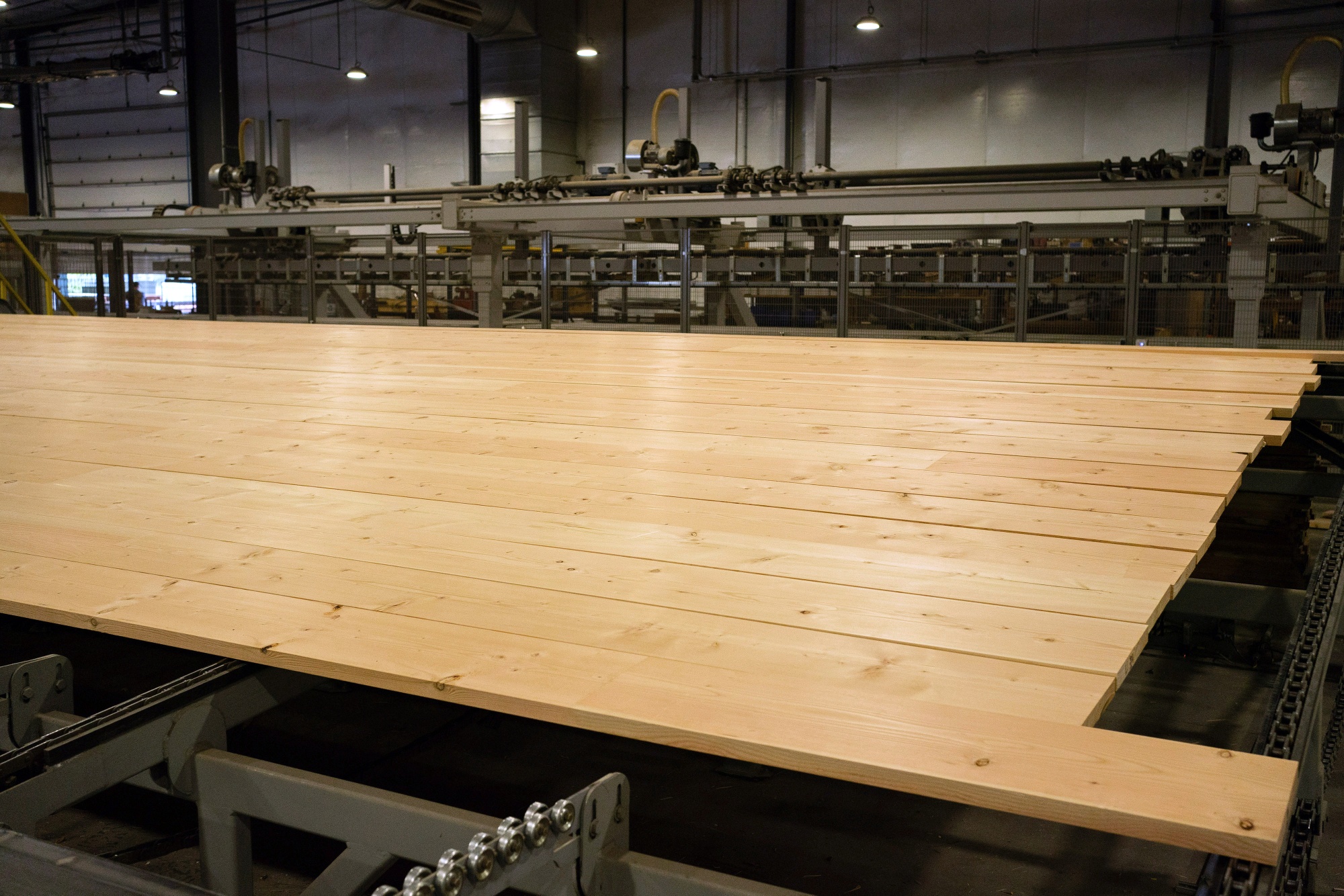在科尔维尔的Vaagen Timbers制造工厂里,切割木材的长度。有腐烂迹象的木板将被从堆栈中取出。摄影师:玛格丽特·奥尔鲍/Margaret Albaugh/BloombergTom Baun,Vaagen的高级业务发展经理,表示当他开始销售这些产品时,他需要解释从材料是如何制造的到如何使用的一切。“我感觉自己像是一名挨家挨户的字典推销员,”他说。