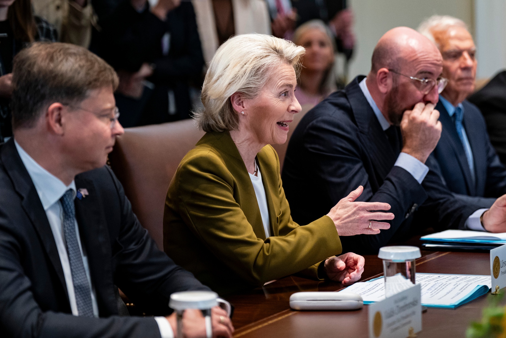 乌苏拉·冯·德·莱恩和查尔斯·米歇尔在华盛顿特区白宫内阁会议室于10月20日举行会议。摄影师:Al Drago/Bloomberg冯德莱恩完全支持欧盟立场如她的发言人所说,在10月15日理事会声明中表达的,而米歇尔的发言人表示,他已经为避免地区升级和加强欧盟在国外形象和信誉方面做出了重大努力。