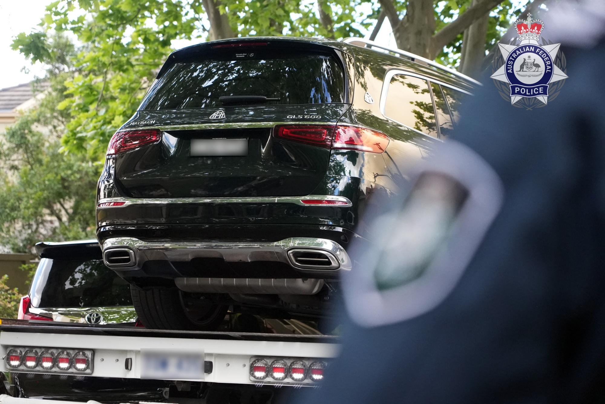 一辆梅赛德斯被没收,来自墨尔本郊区库区。来源:澳大利亚联邦警察澳大利亚警方逮捕了七人,并没收了价值超过5千万澳元(3160万美元)的财产和车辆,这是对一起有组织犯罪团伙涉嫌洗钱的14个月调查的结果。