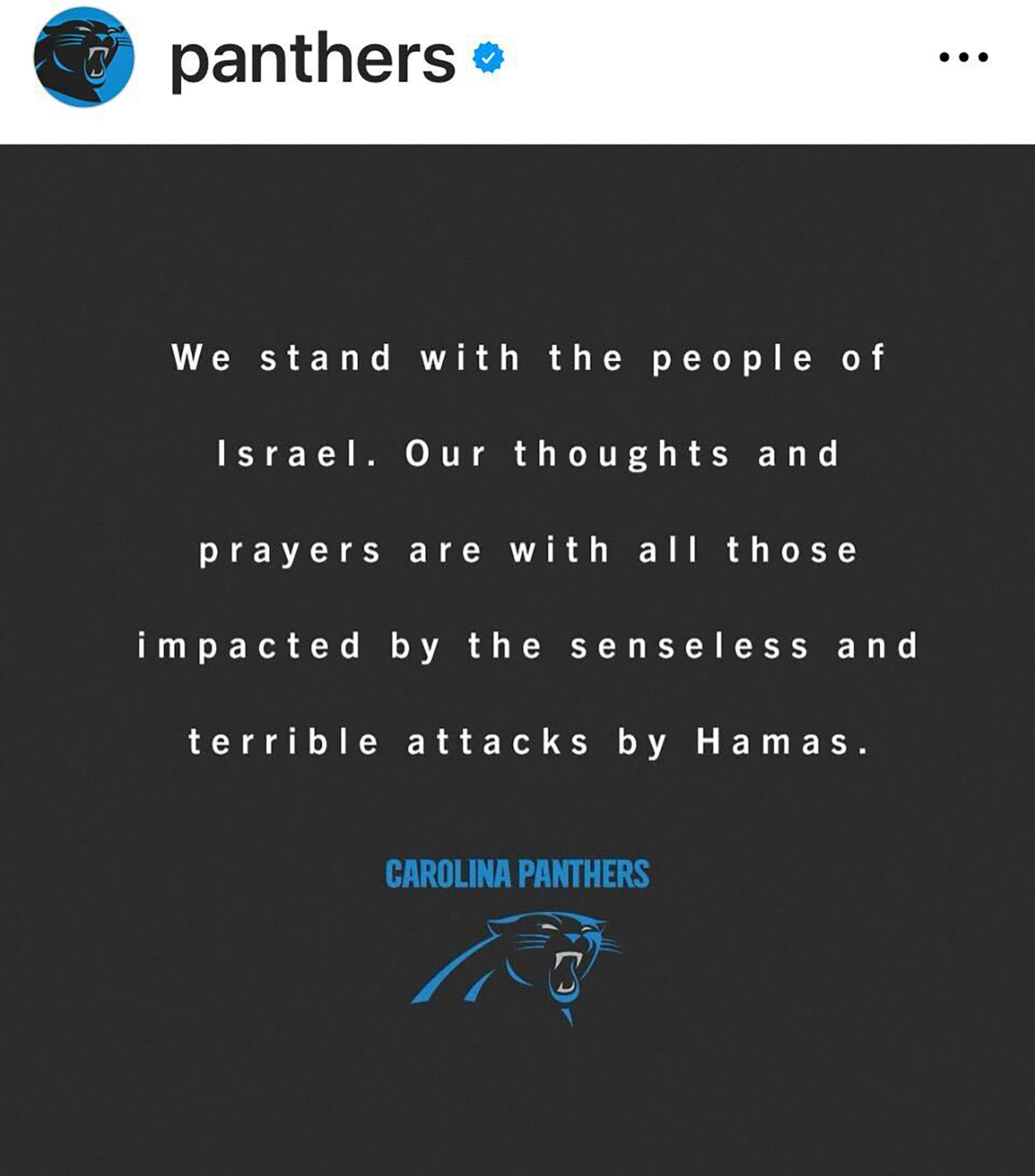 卡罗来纳黑豹队的Instagram页面表达对以色列的支持。来源:卡罗来纳黑豹队在网上,大多数人通过屏幕目睹以色列和加沙的可怕事件,混乱是其主要特征。