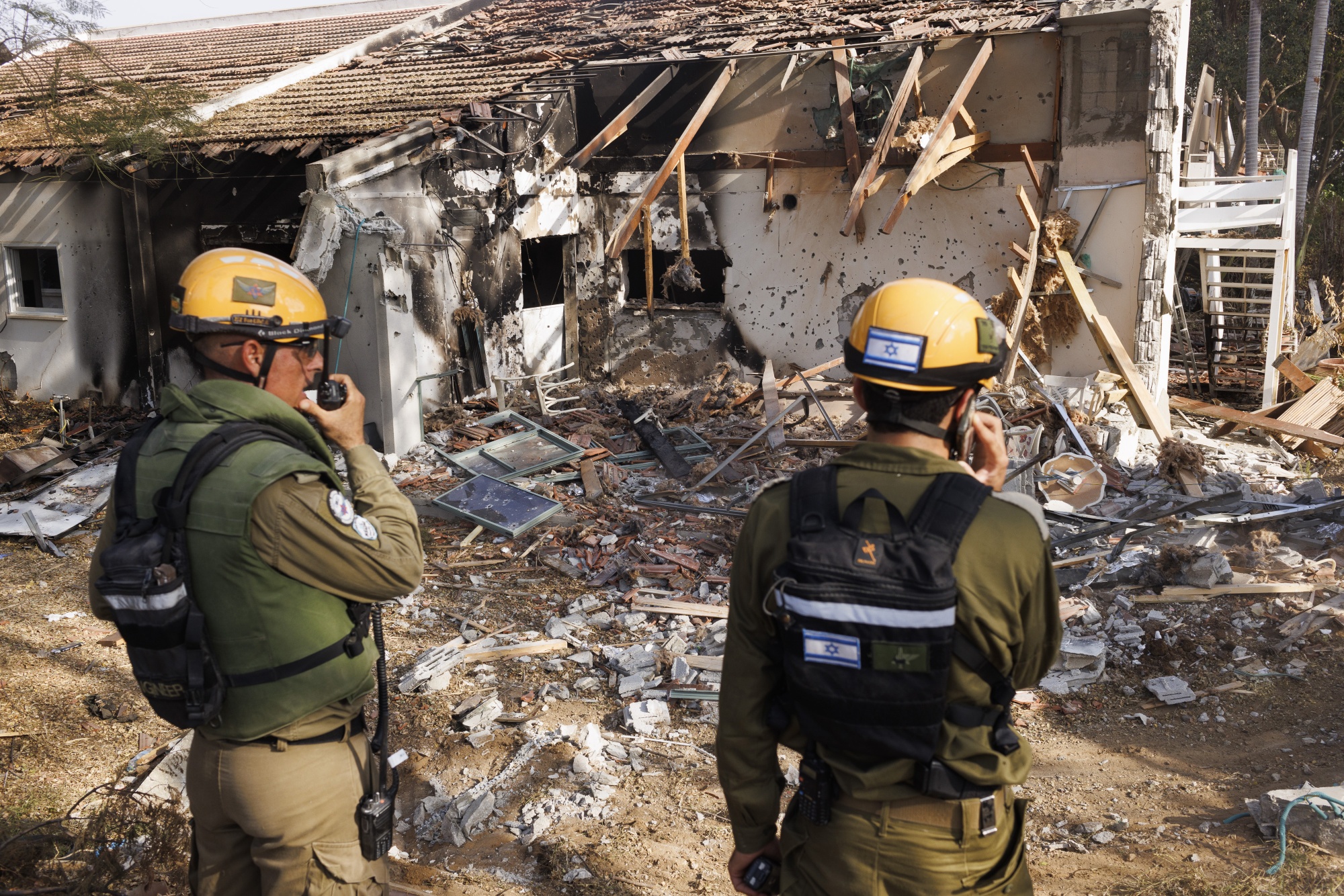 以色列救援人员在2023年10月22日在贝埃里基布兹遭到哈马斯激进分子袭击的遇难者尸体。