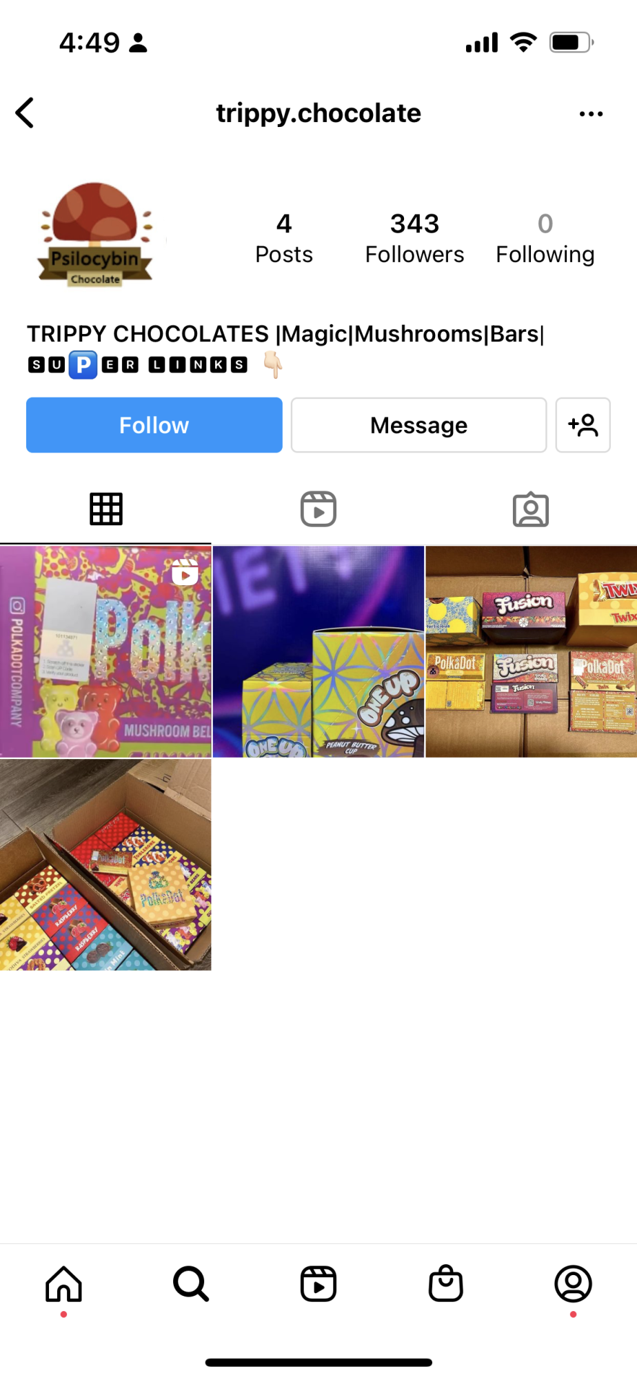 一个名为@trippy.chocolate的账号,链接到一个在线商店,称‘蘑菇可以用来治疗抑郁症、创伤后应激障碍和对包括酒精、药物和烟草在内的物质的成瘾。该商店未回复评论的电子邮件,而Instagram账号随后消失了。