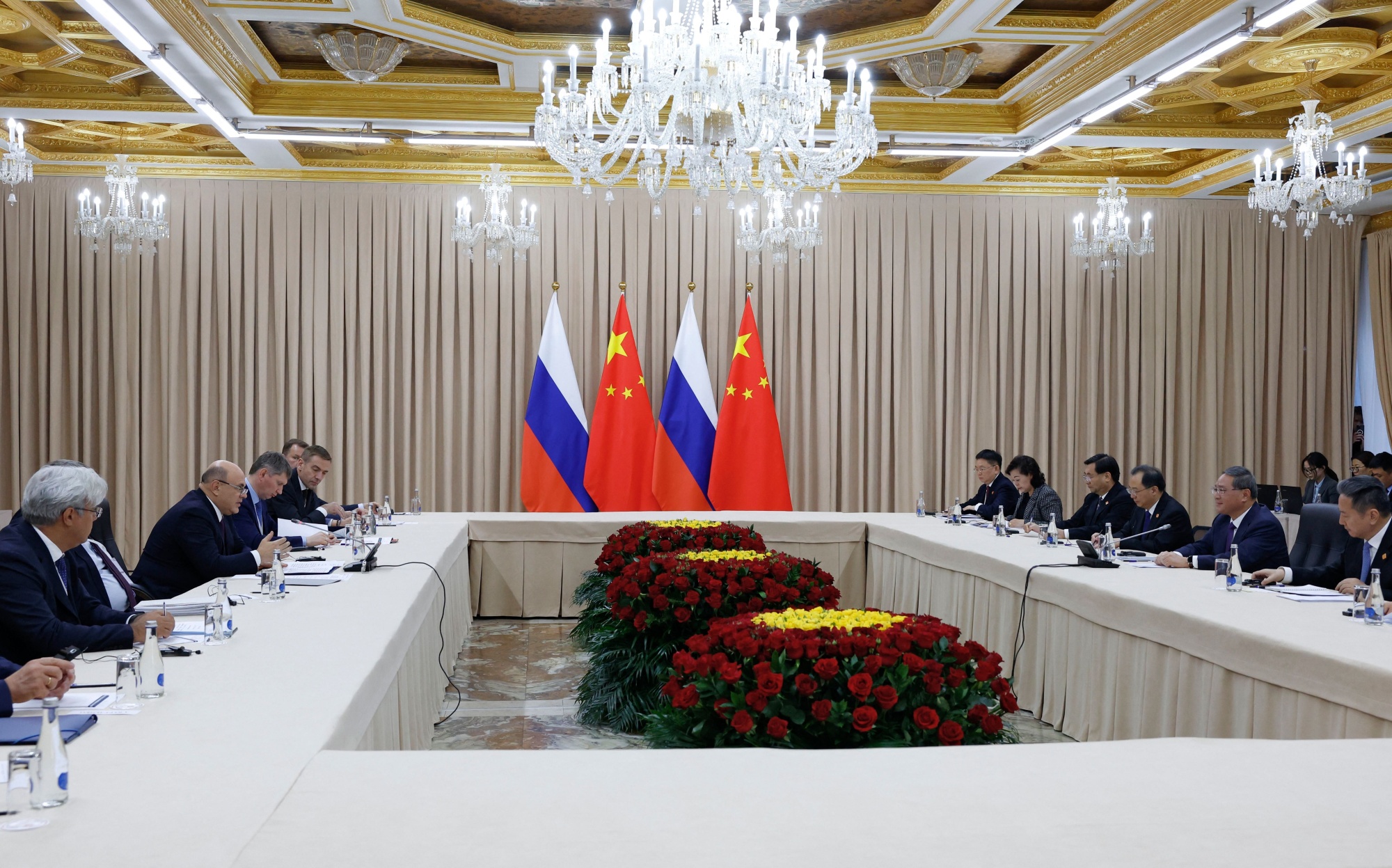 米哈伊尔·米舒斯京(Mikhail Mishustin)左,与李强(Li Qiang)于10月25日在比什凯克会面。
