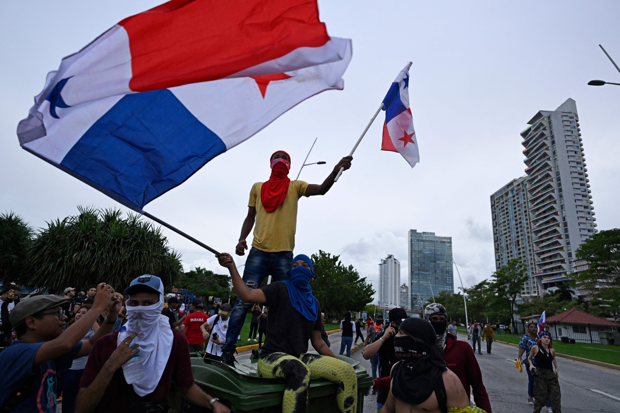 示威者抗议加拿大矿业公司FQM在巴拿马城的合同。摄影师:Luis Acosta/AFP/Getty Images巴拿马大学和巴拿马建筑工人工会的成员发表声明,要求政府废除新合同,并就此问题进行全国公投。