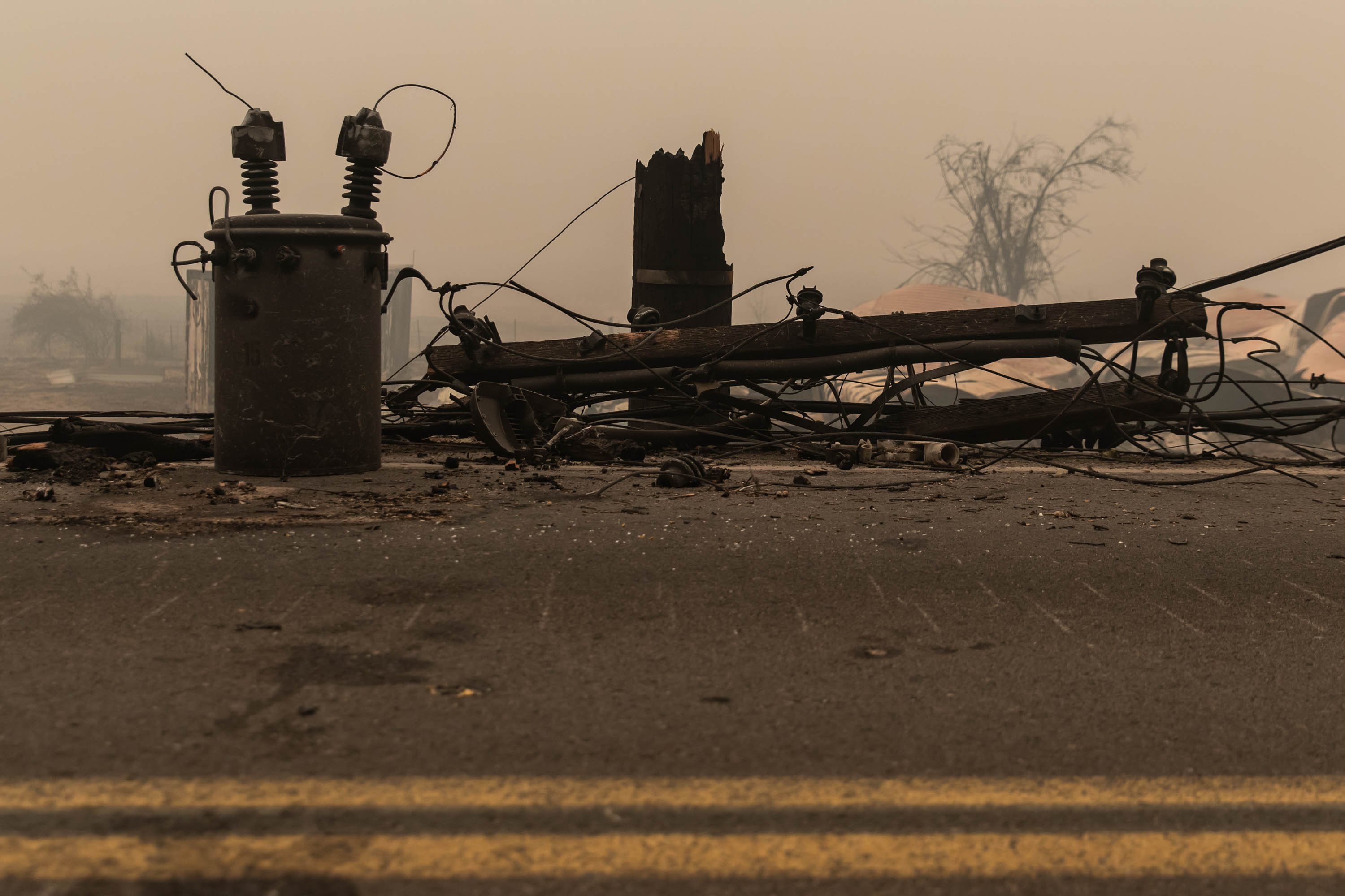 加利福尼亚格林维尔市因迪克西大火而被摧毁的公用事业箱和电线杆。
