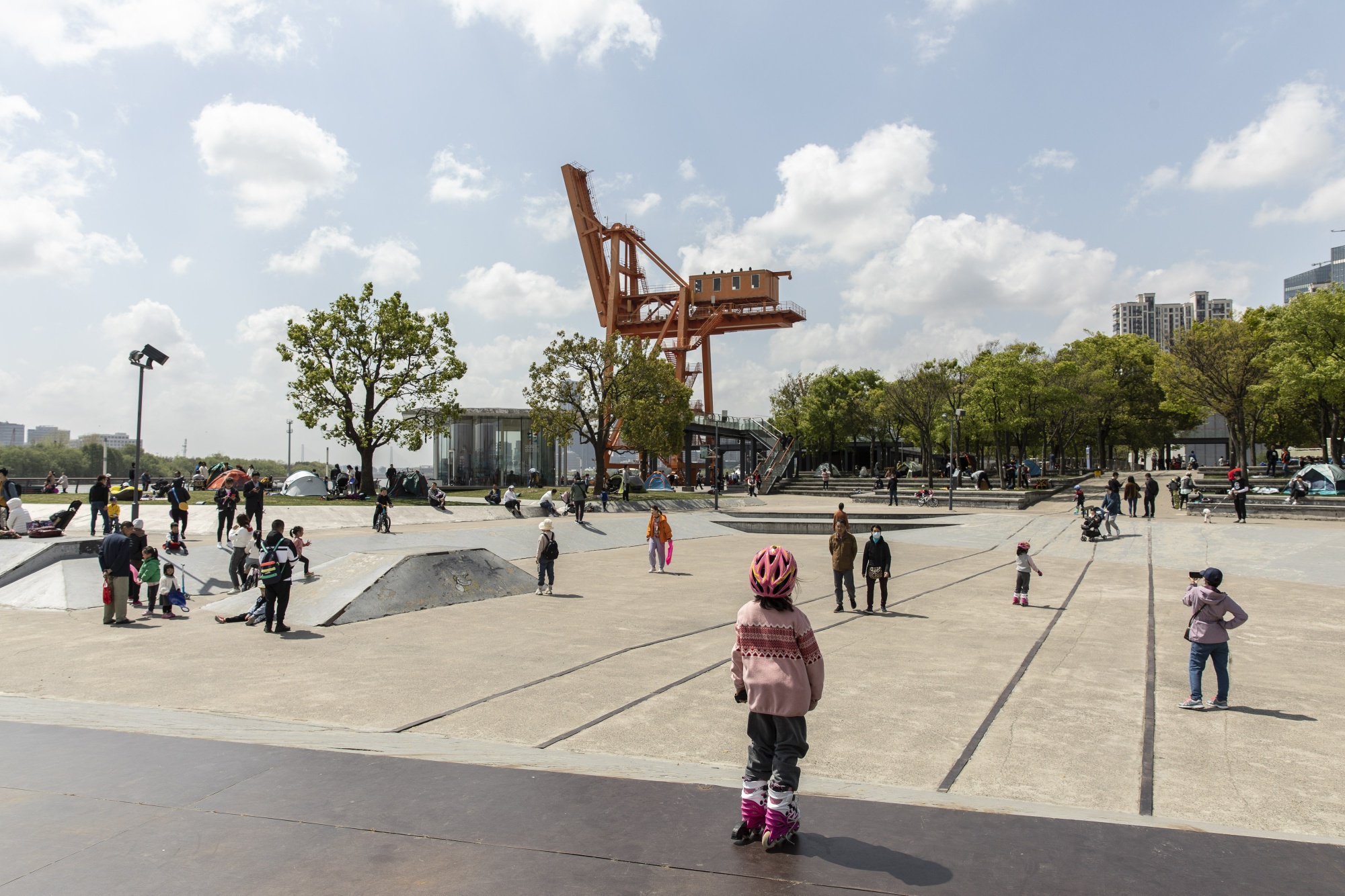 孩子们在上海的河畔公园玩耍。
