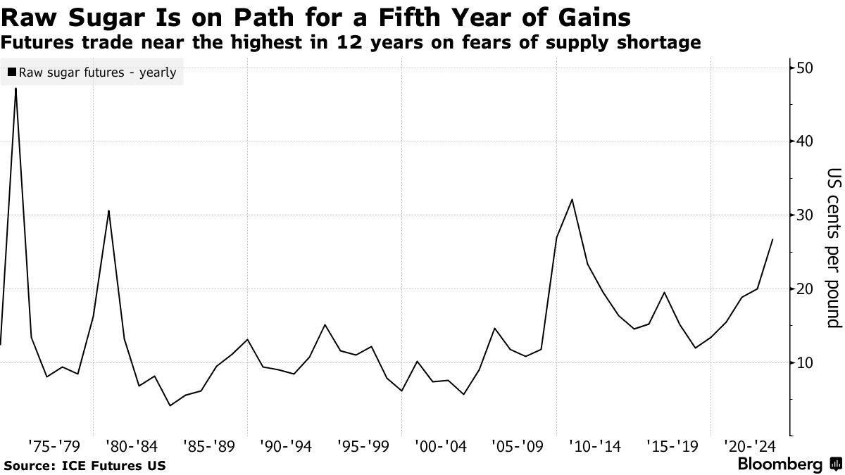 印度和泰国的作物欠佳以及出口限制的威胁已经使纽约原糖期货价格连续第五年上涨,这是自1989年以来的最长涨势。随着全球库存预计将降至13年来的最低水平,世界再次依赖巴西来满足增长需求。