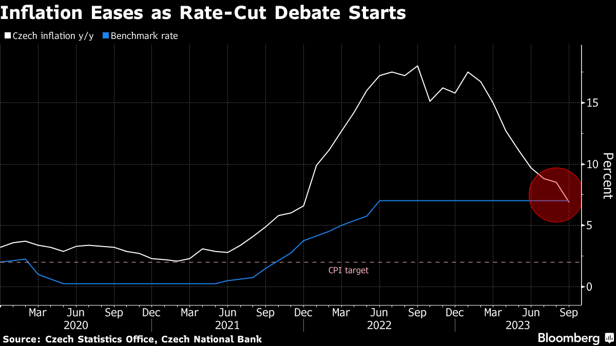 捷克央行可能会在今天宣布三年多以来的首次降息,因为通胀迅速回落、经济收缩增加了转向货币宽松的紧迫性。布拉格的决策者们正在权衡开始降低借贷成本的最佳时机,快速放缓的价格增长和需求疲弱支持了降息的论点。