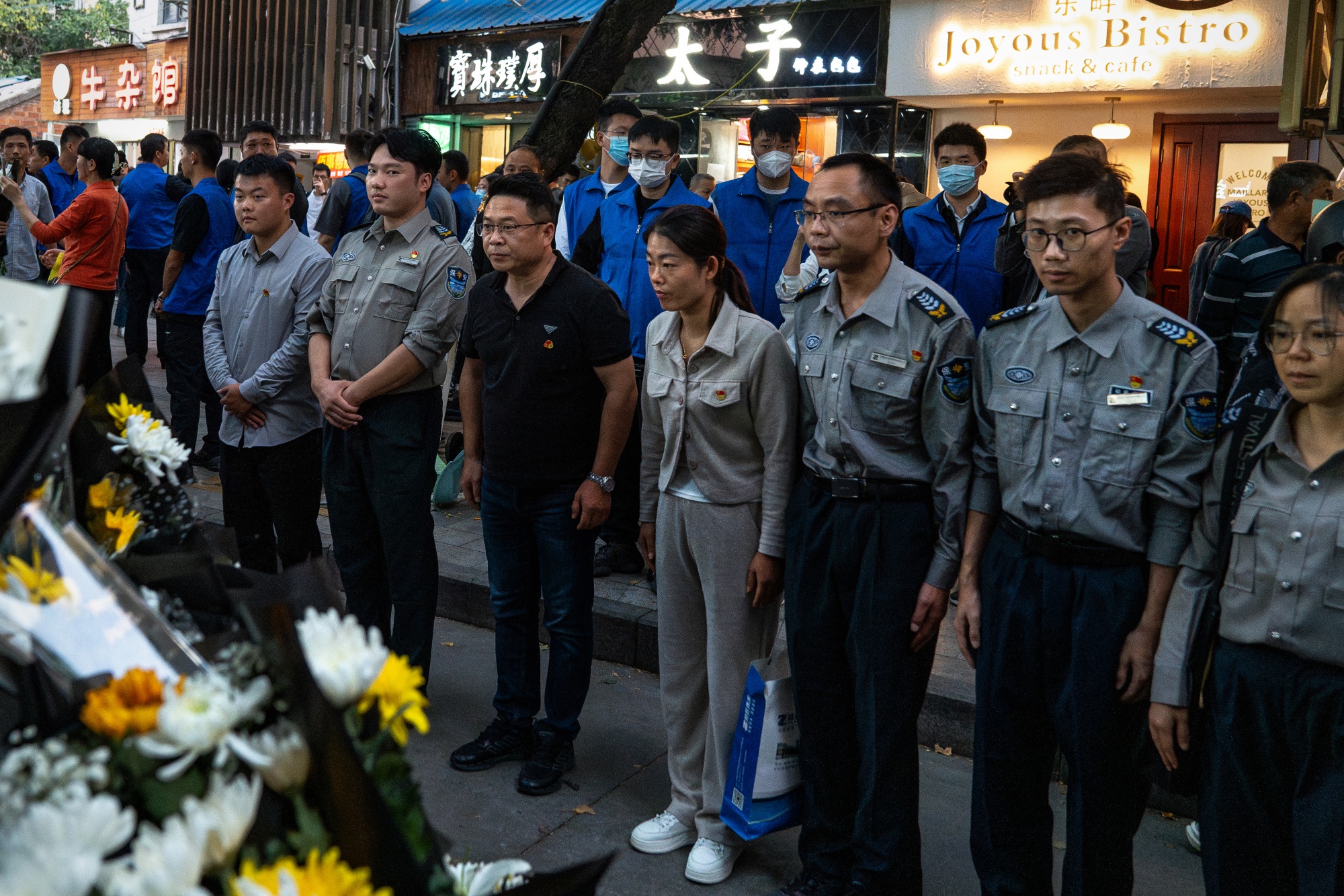 在安徽省省会合肥,周三,数十名穿着蓝色背心的共产党志愿者在李克强童年家中外仍在排队膜拜的人群中巡逻。