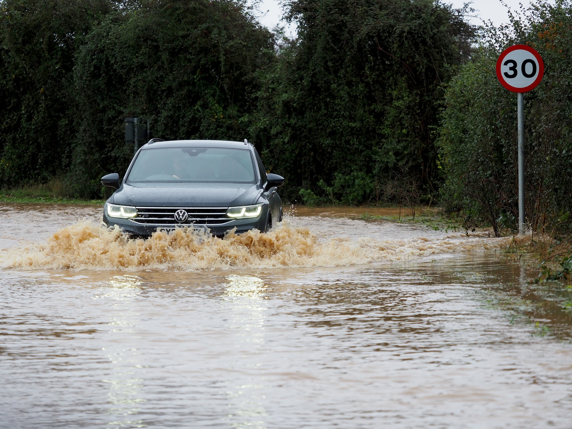 一辆汽车冒着风暴后的洪水在西苏塞克斯郡的Yapton镇前行