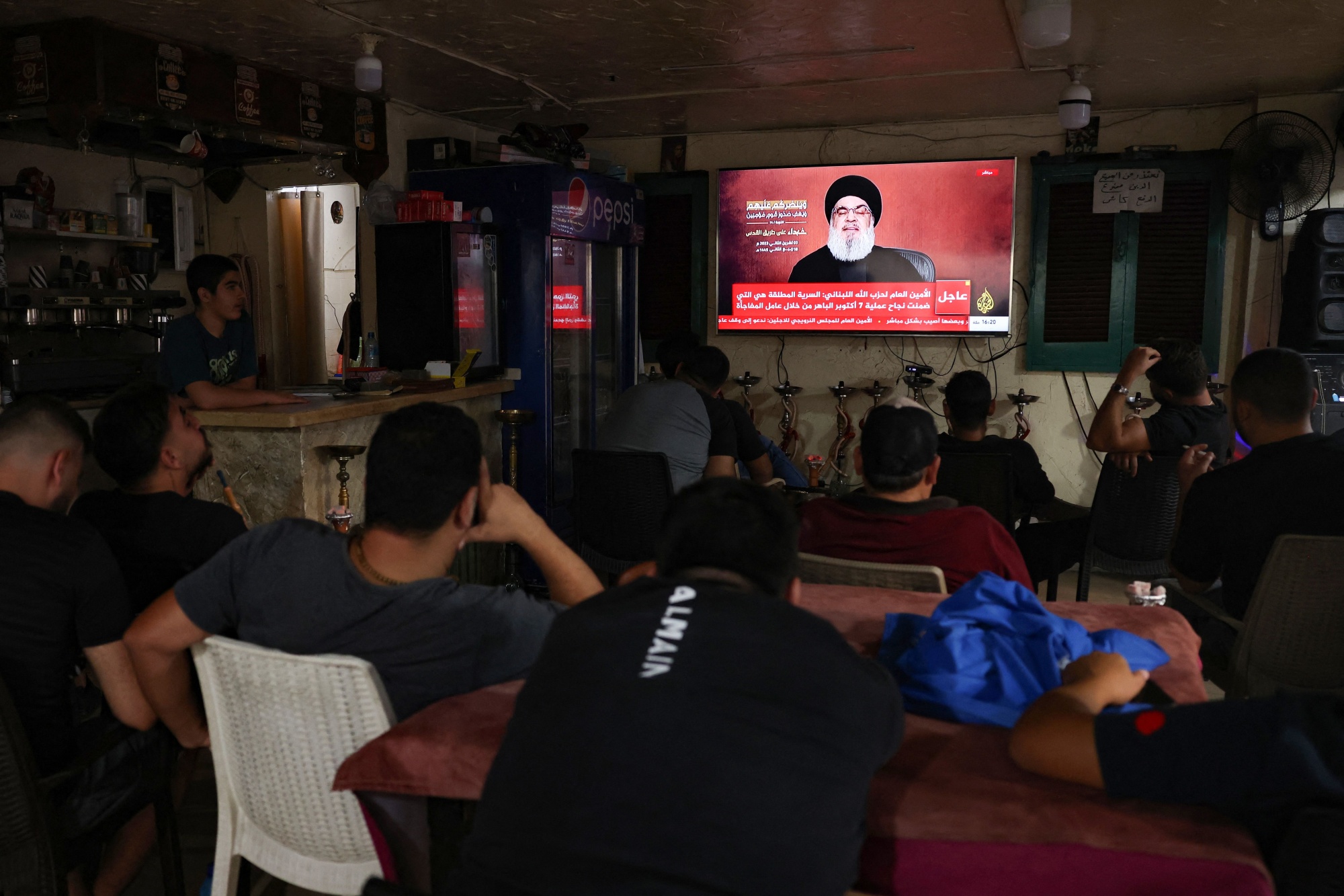 人们聚集在贝鲁特,黎巴嫩的一家咖啡馆里,观看了11月3日Hasan Nasrallah的电视讲话。