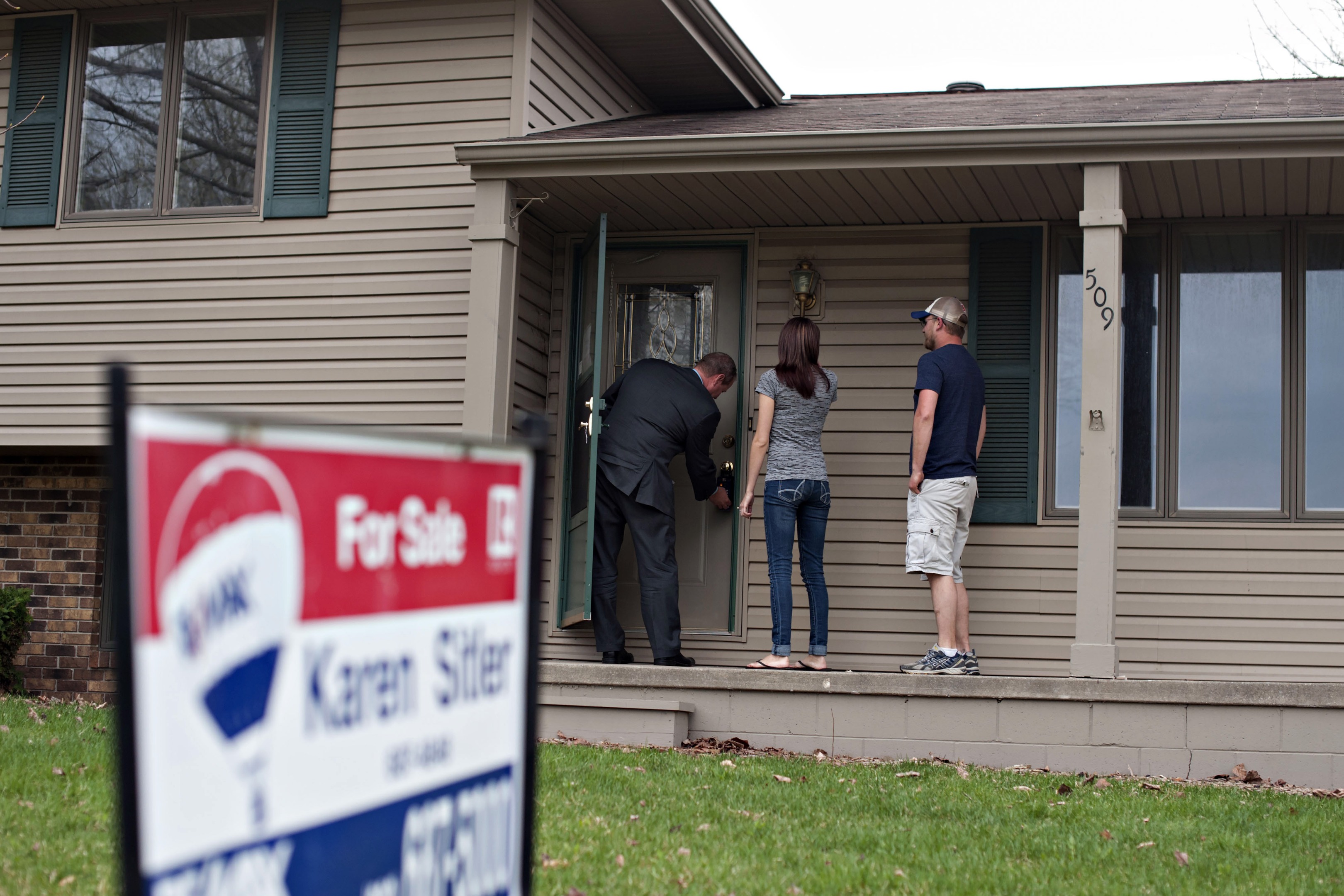 一名房地产经纪人在伊利诺伊州华盛顿为潜在的购房者打开前门。
