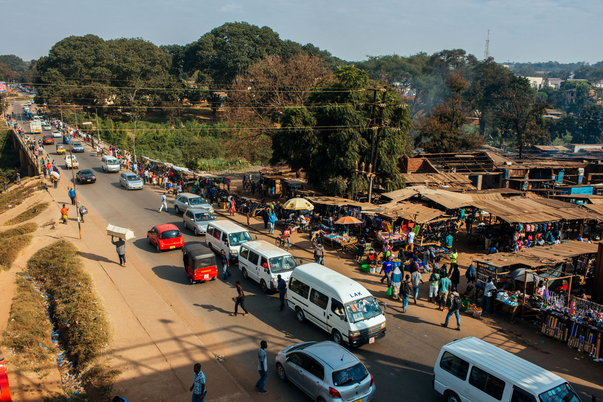 汽车和卡车经过马拉维利隆维的市场摊位。