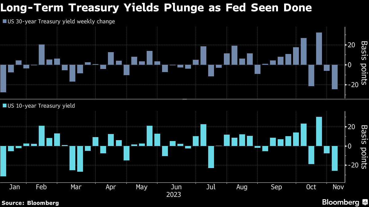 摄影师:okies3D/iStockphoto你好,祝你周日快乐,来自纽约市,年度马拉松比赛正在五个行政区穿行,街道两旁挤满了为跑完26.2英里赛程的人加油的支持者。在美国,由于夏令时仍在实行,我们多睡了一个小时。,尽管过去曾努力让其消失。好好休息,因为又是一个充实的一周。以下是你需要知道的。 **大局观。**对于债券交易员来说,几周前可能看起来不可思议的前景正在显现:美国国债有可能自2020年以来首次实现年度收益。美国政府债券正经历着一轮周线涨势,让人联想起首次Covid封锁期间市场混乱的情景,最新的火花是在周五出现的,迹象表明美国的就业增长正在放缓。