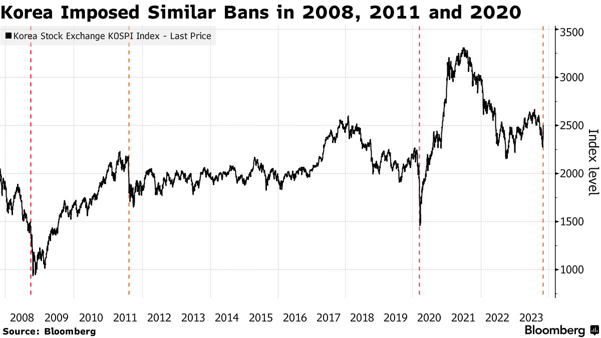 尤金投资证券分析师许在煥表示,这是“不寻常的”,因为当时没有重大外部风险,当局正在全面禁止做空交易。韩国曾在2008年全球金融危机期间、2011年欧元区债务危机期间以及2020年疫情初期禁止做空交易。