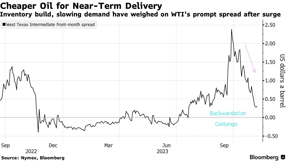 石油刚刚经历了连续第二周的下跌,因为需求疲软再次对价格施加压力。情绪转变在西德克萨斯中质原油即期价差急剧回落中体现出来,该价差在9月份激增,因为沙特阿拉伯和俄罗斯延长了他们的减产措施,同时对全球供应收紧的担忧加剧。但是,美国库存在10月初大幅增加,最近在俄克拉荷马州库欣关键储存中心的小幅增长有助于抵消这些担忧,再加上以色列-哈马斯战争暂时保持局限的预期。周一交易中,西德克萨斯中质原油和布伦特原油期货价格都有所上涨。