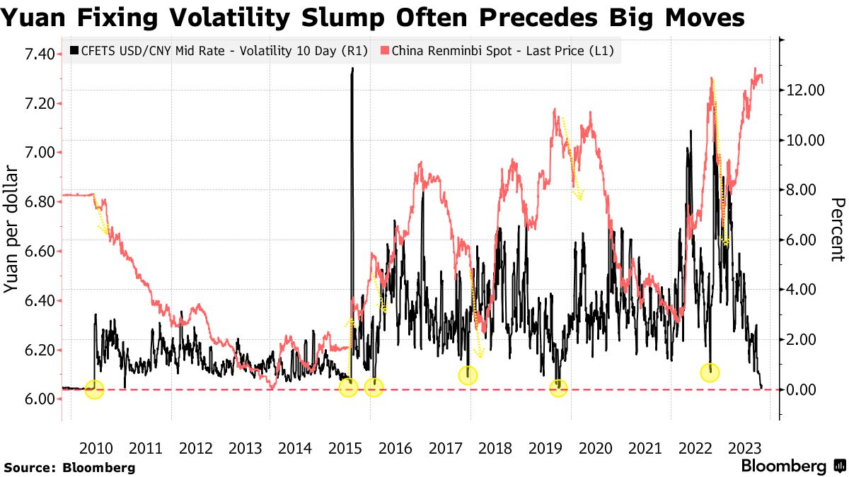 过去十年中波动率下降到类似水平通常预示着人民币的大幅波动。
