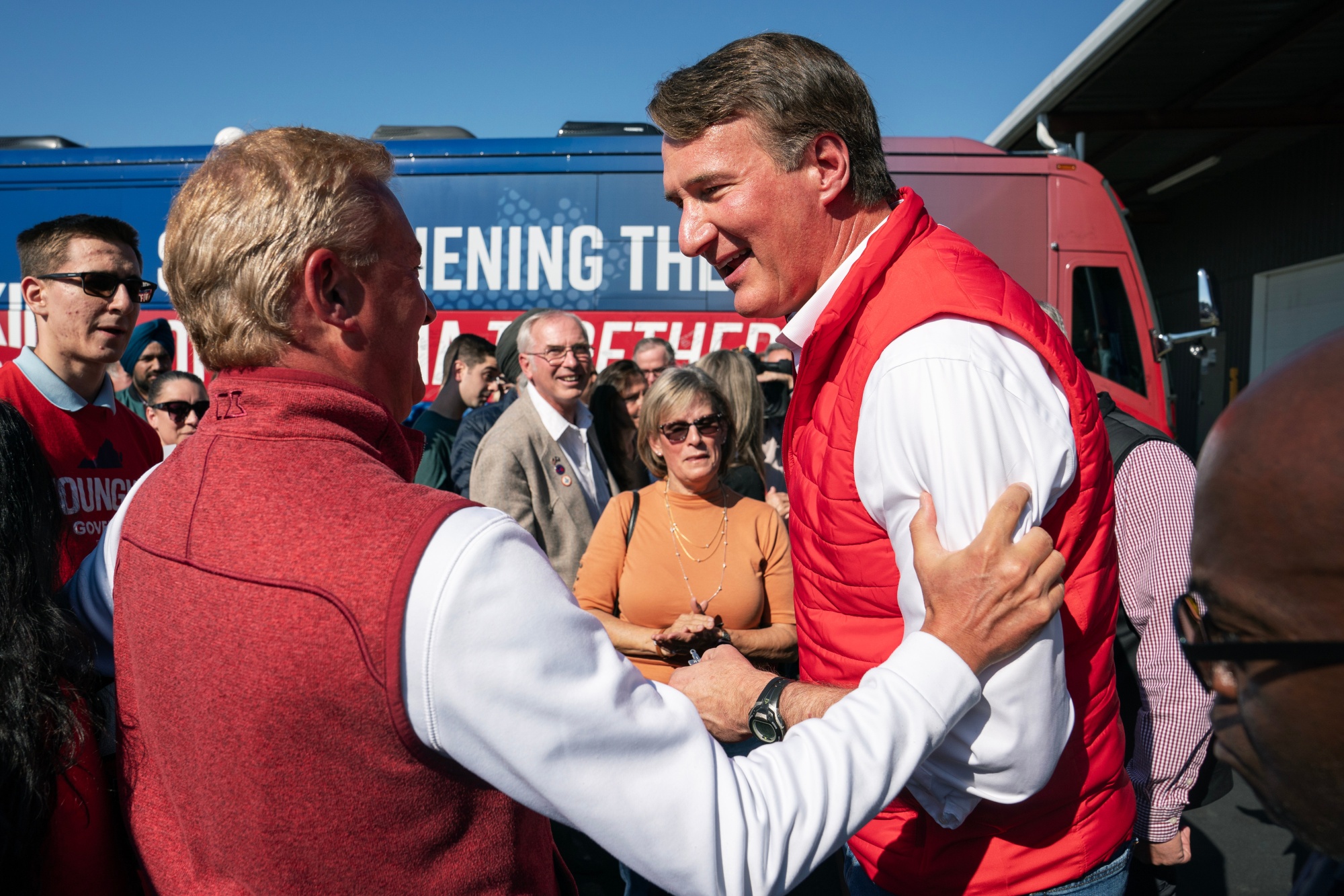 弗吉尼亚州州长格伦·杨金在里士满的“动员选民”集会上向支持者致意。
